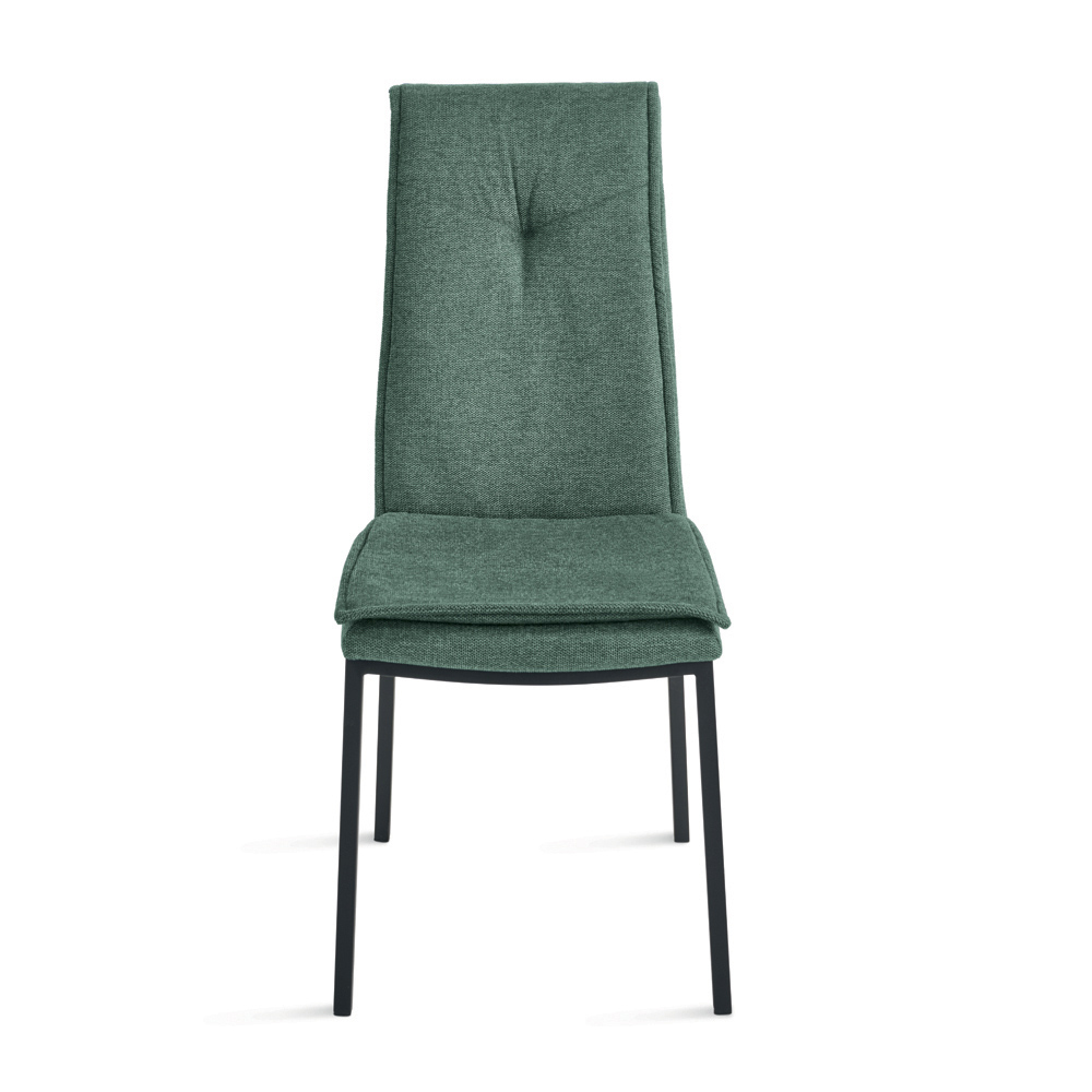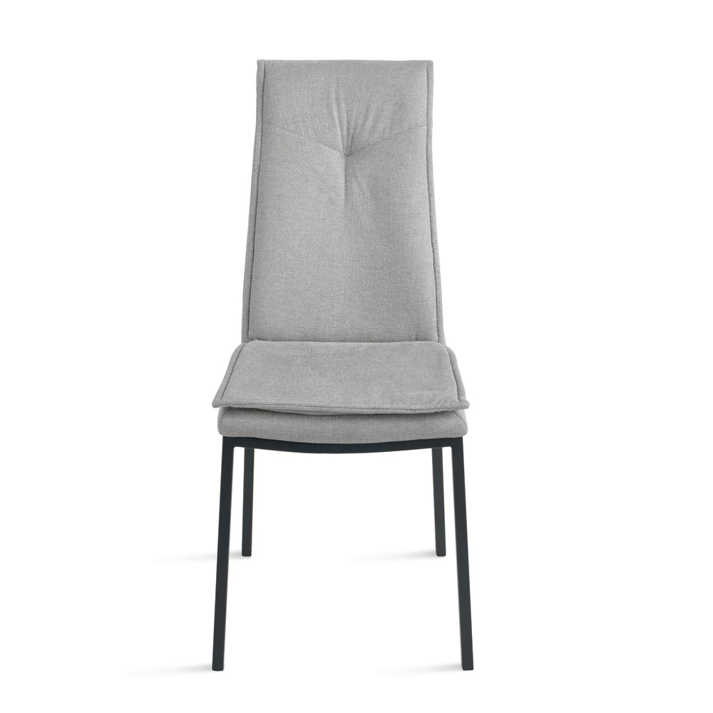 Cette chaise se distingue par son profil élancé et son dossier haut, conçu pour offrir un excellent soutien au dos et aux épaules, garantissant ainsi un confort optimal même lors de longues heures passées à table. Le rembourrage est orné de surpiqûres décoratives au centre du haut du dossier, un détail élégant qui rehausse le design de l'assise.
