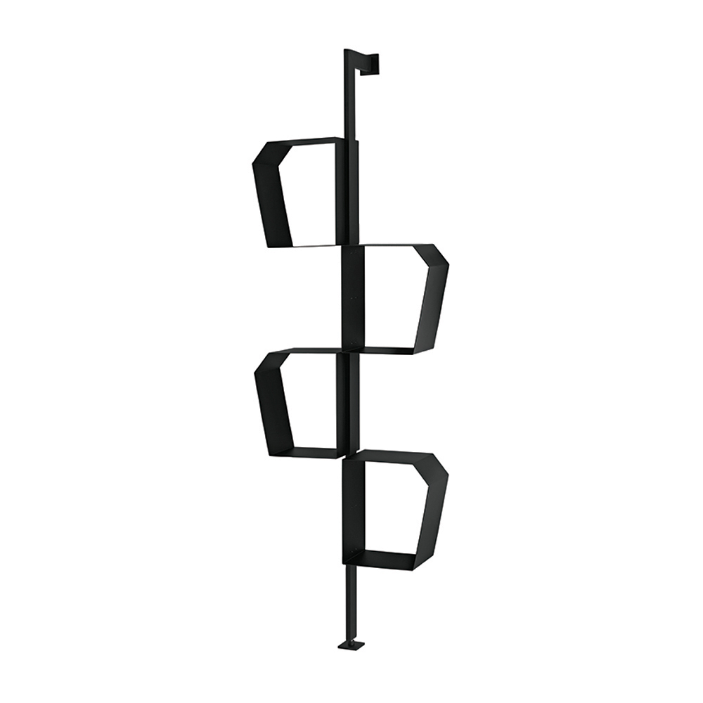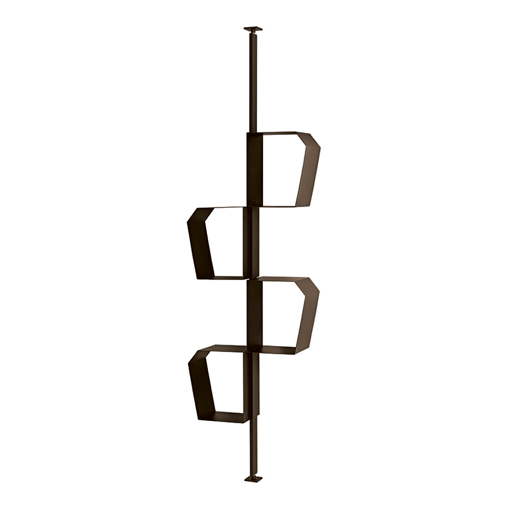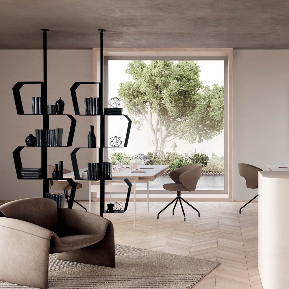 Grâce à sa configuration polyvalente, la bibliothèque peut être fixée au mur ou au plafond . Fixée au plafond, elle peut également servir de cloison , idéale pour séparer les espaces tout en préservant une impression de légèreté.