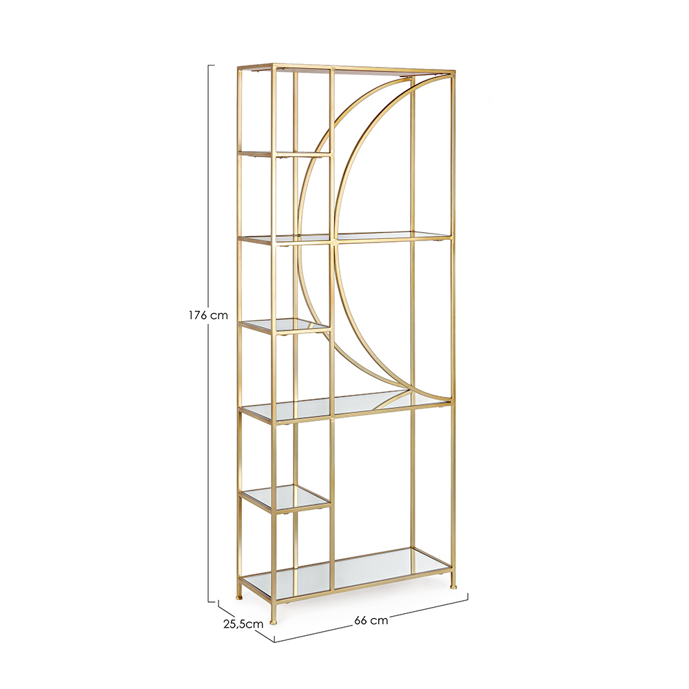 Bibliothèque autoportante en acier et étagères en verre au design élégant.