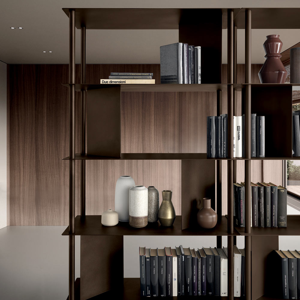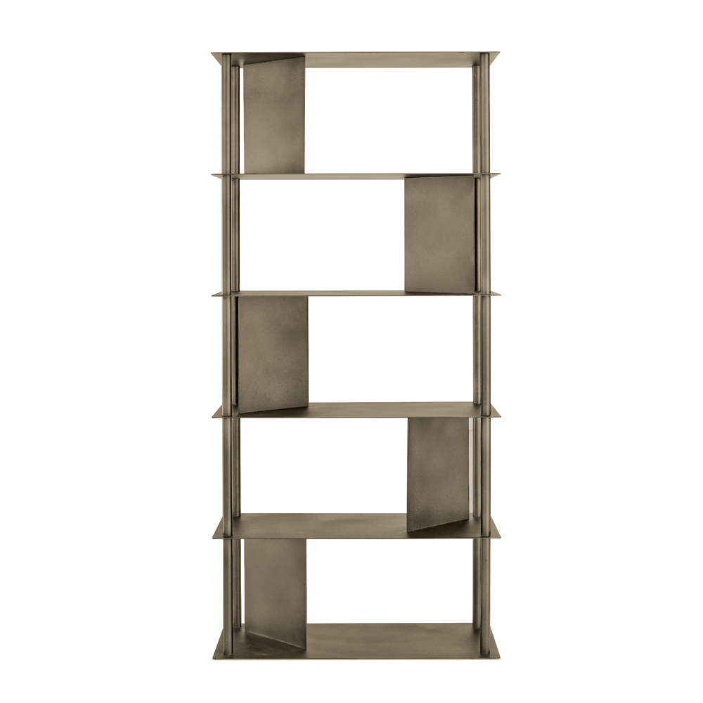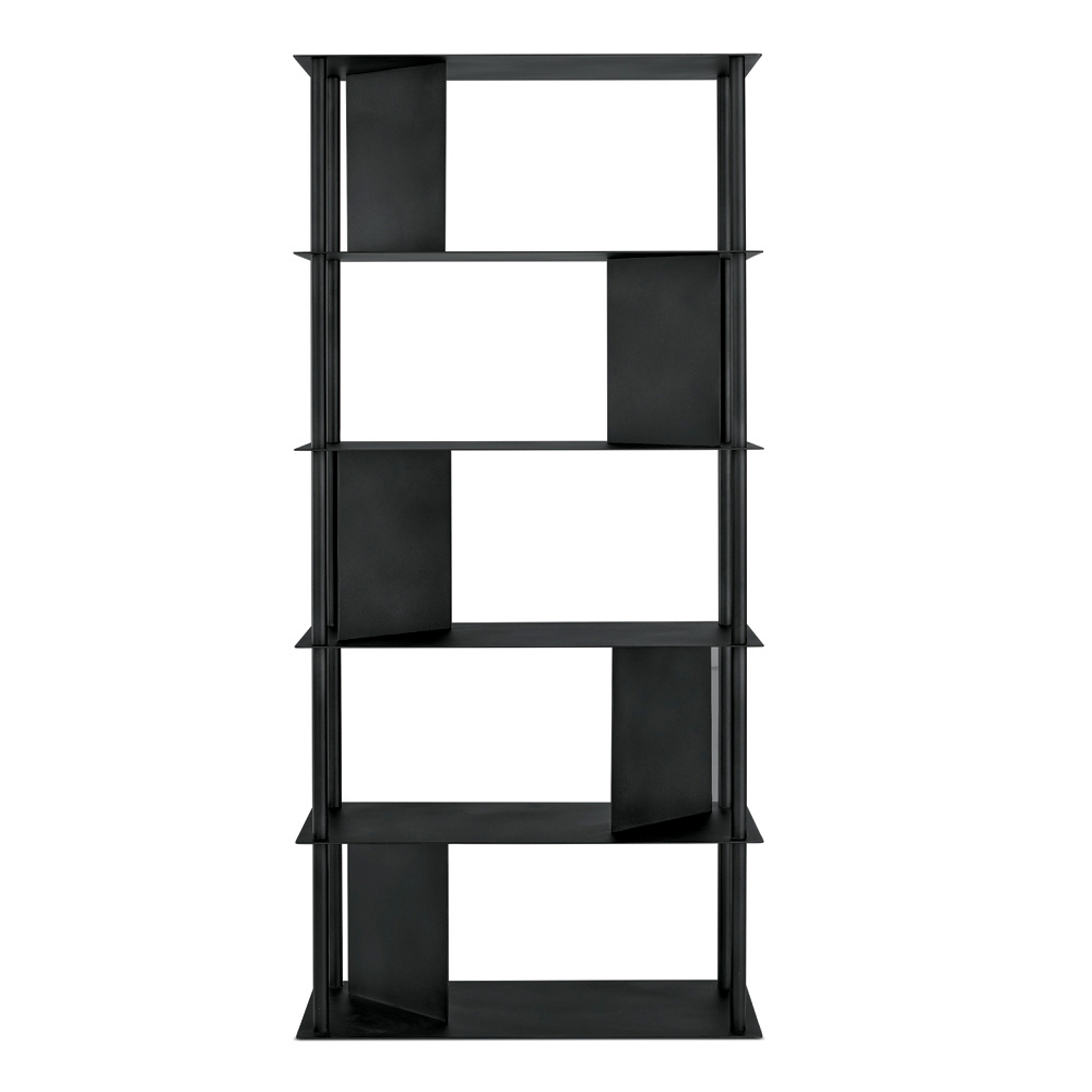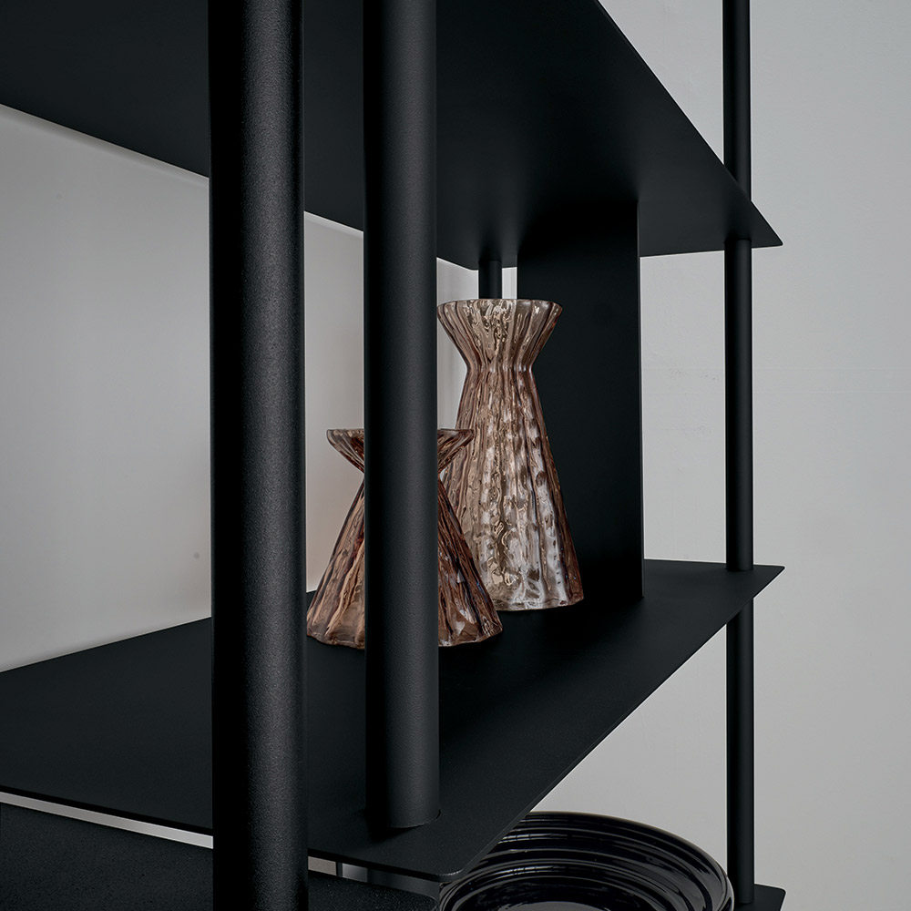 Fabriquée en métal peint , la bibliothèque se compose de quatre tubes verticaux périphériques soutenant les étagères, entrecoupés de plaques inclinées qui délimitent l'espace et servent de supports pour les livres et les objets. Cette configuration crée un jeu subtil de pleins et de vides, conférant dynamisme et profondeur à l'ensemble.