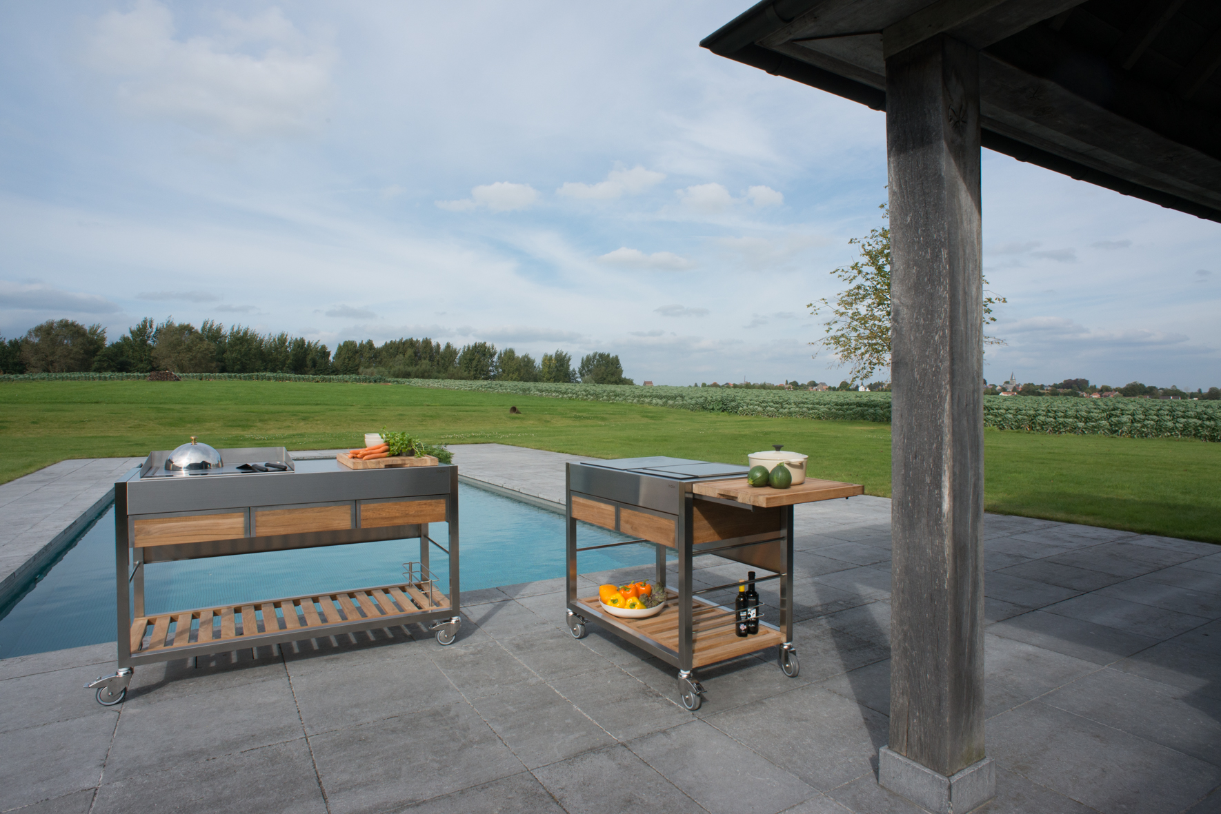 Pour une idée originale et fonctionnelle pour ceux qui aiment cuisiner et rester à l'extérieur, les cuisines de jardin de la collection Viadurini in the Garden. Cuisines d'extérieur fonctionnelles facilement transportables grâce aux roulettes, elles sont en bois de teck et en inox brossé.