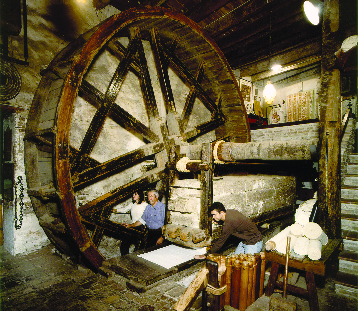 Son fonctionnement est dû à l'équilibre entre la roue et le rocher sur le côté. La roue agit comme un levier et déplace le rocher qui a la tâche importante de repasser et de compacter la toile. Les deux pèsent 55 quintaux et, grâce à ce rapport parfait, le mangle se déplace lorsque l'homme entre dans la roue avec son propre poids brise l'équilibre. La toile est enroulée autour de rouleaux en bois appelés poutres. Les rouleaux sont positionnés sous le bloc et suivent le mouvement de la pierre, d'avant en arrière, permettant ainsi un repassage. C'est le seul poids de l'homme à faire bouger la roue, facilitant ainsi cette opération appelée foulage. Aujourd'hui encore, avant d'imprimer la toile et après l'avoir imprimée, nous procédons à ce tour de roue pour embellir les tissus et obtenir un excellent résultat.