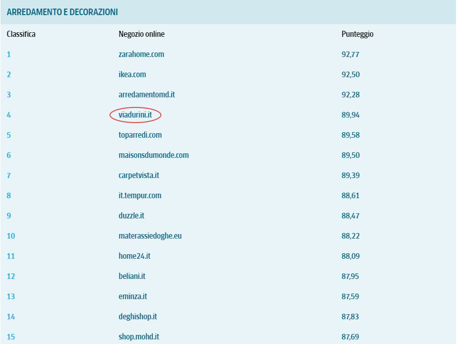 Grâce aux résultats obtenus, Viadurini est fier de pouvoir fêter sa 4e place au classement derrière des géants comme Ikea et Zarahome. Le sceau «Les étoiles du commerce électronique 2020/2021» devient un nouveau prix qui certifie le statut d'excellence de Viadurini non seulement sur la scène nationale, mais aussi sur la scène internationale.