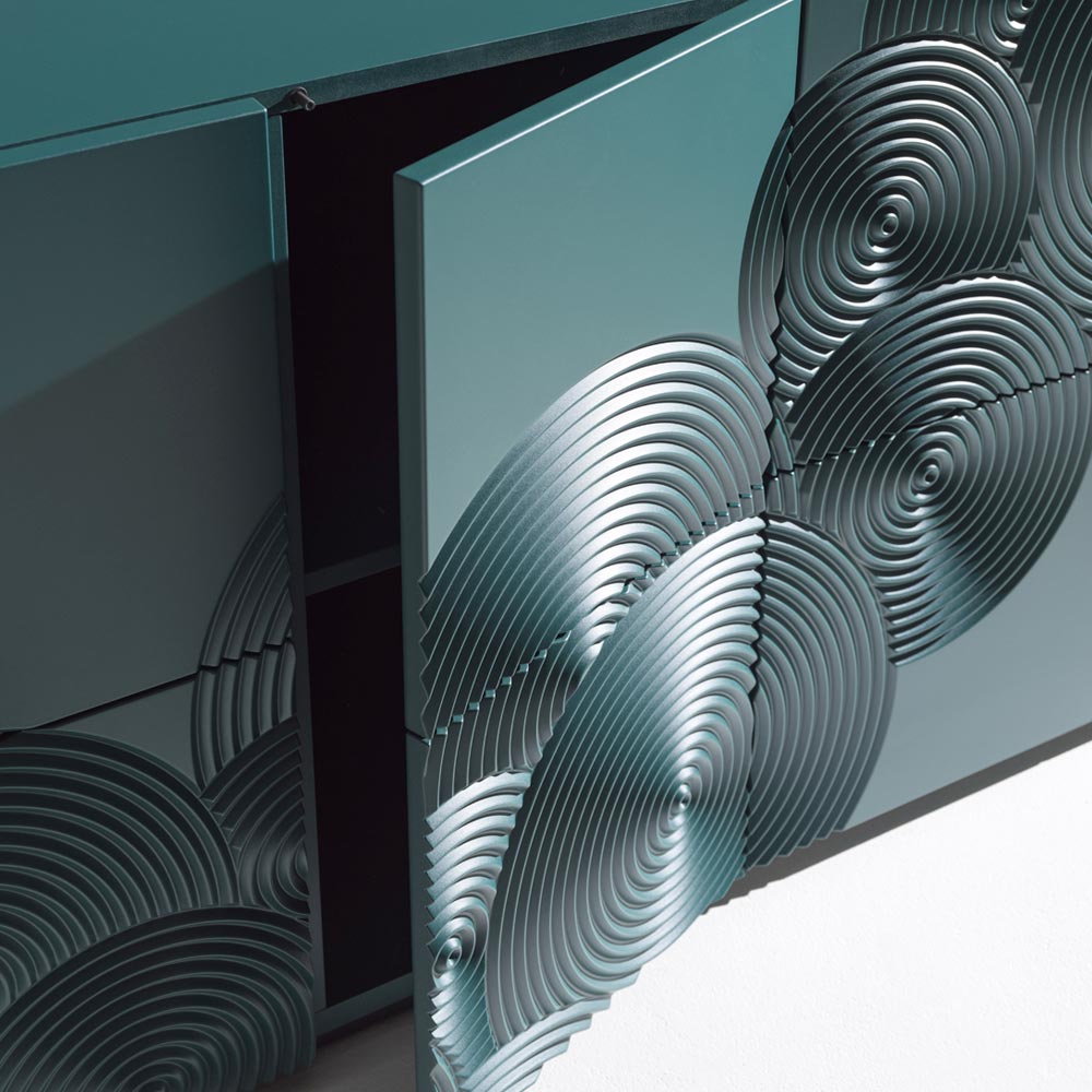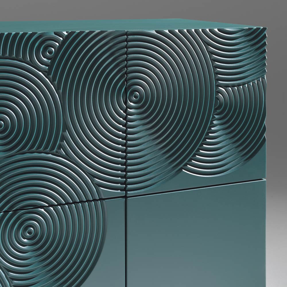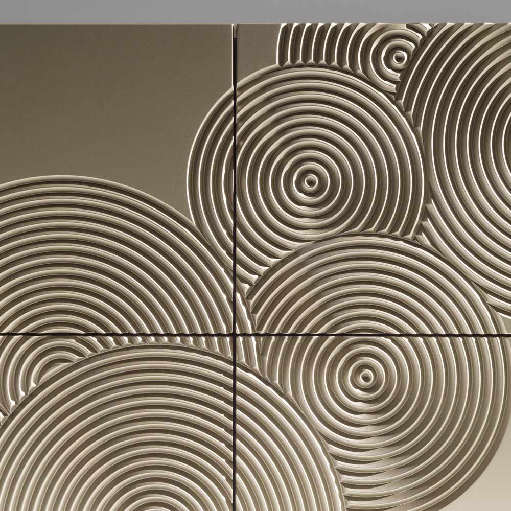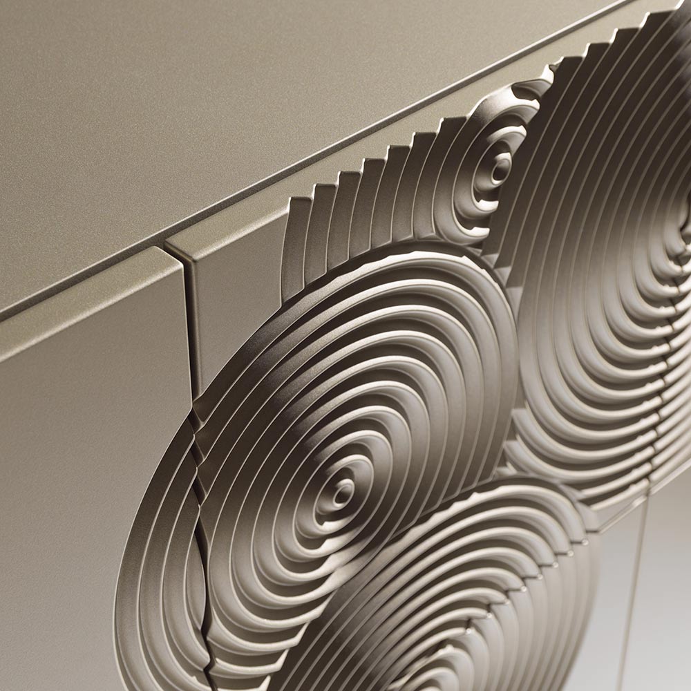 Un buffet à fort impact visuel, caractérisé par un décor raffiné gravé d'un motif circulaire et entièrement fini à la main , capable de créer des jeux d'ombre et de lumière suggestifs sur sa surface.