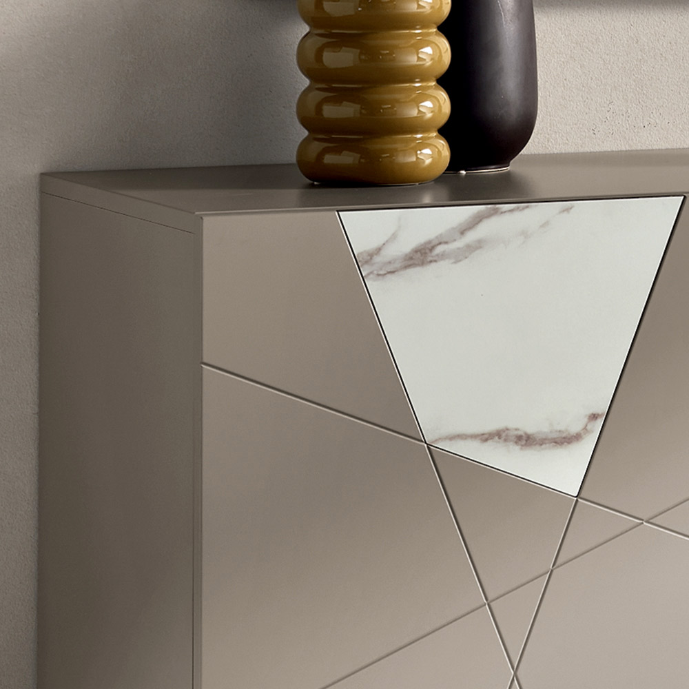 La structure est composée d'un cadre en bois mélaminé et de portes en MDF pantographié , ornées de gravures décoratives s'entrecroisant en un élégant motif géométrique. Les inserts en verre effet marbre rehaussent la surface, créant un jeu subtil de graphismes et de matières.