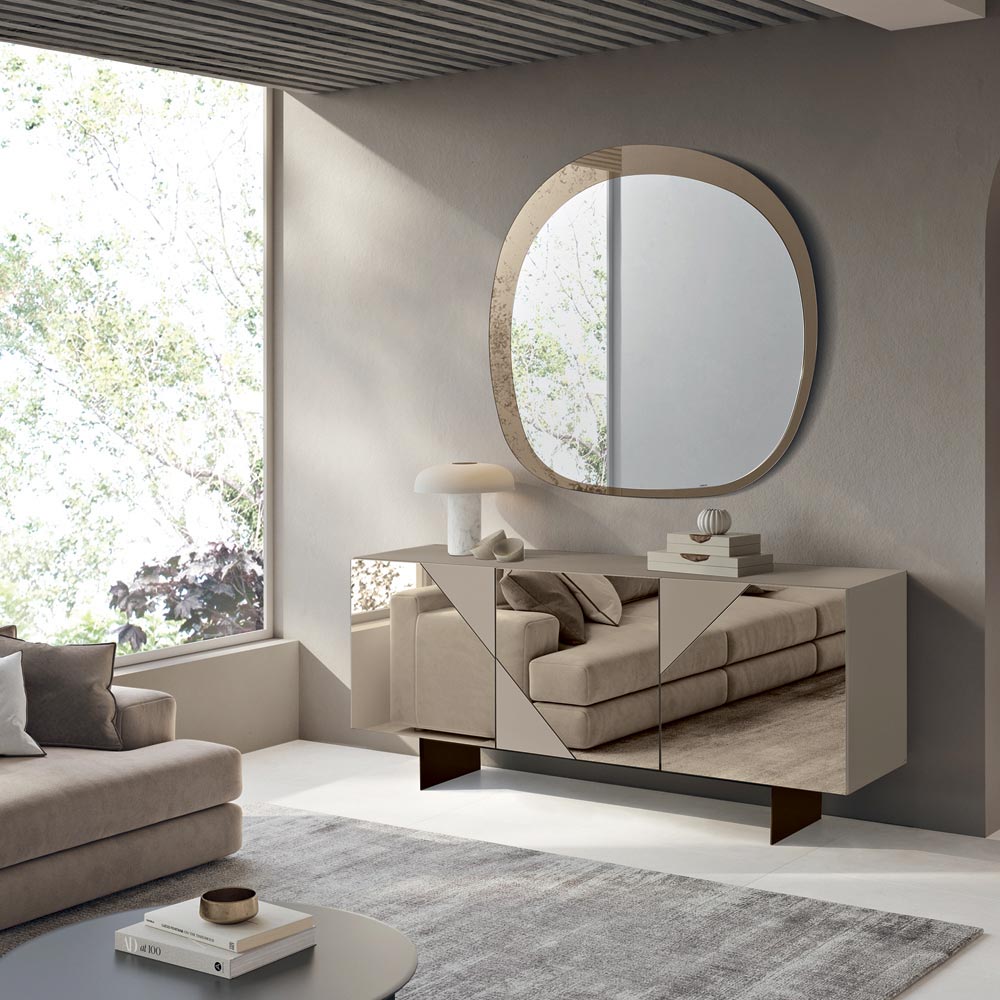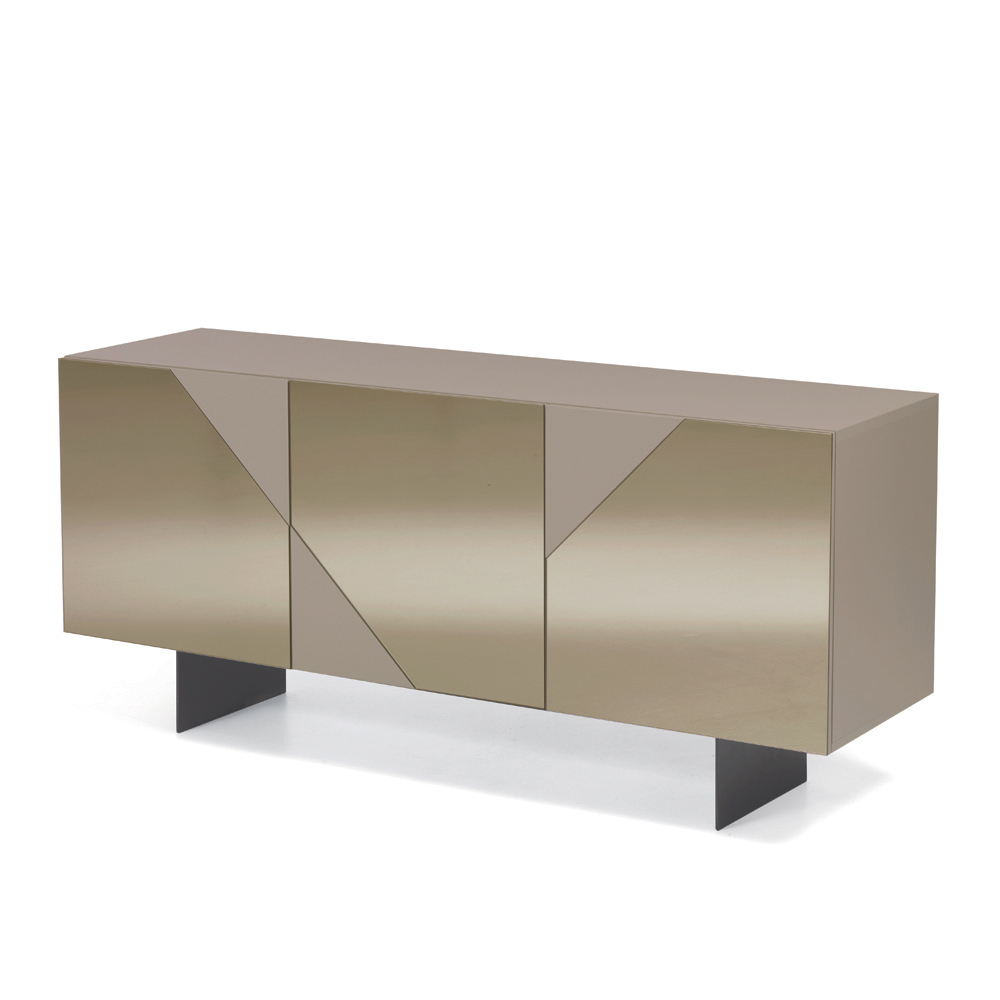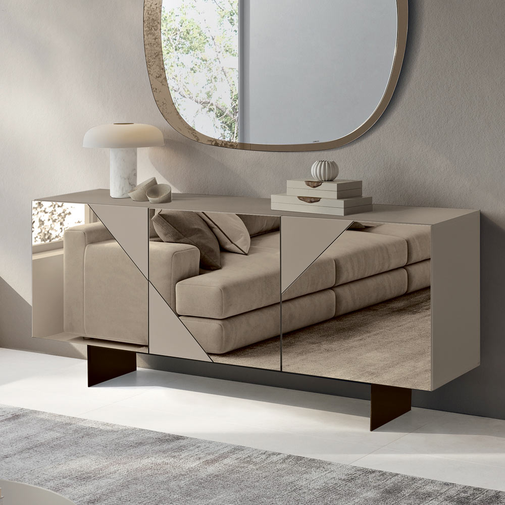 Les portes en MDF sont recouvertes de verre miroir alternant surfaces brillantes et mates , créant un jeu géométrique raffiné qui capte la lumière et apporte de la profondeur visuelle. Ce matériau contrasté confère au buffet élégance et dynamisme, idéal pour les intérieurs modernes et sophistiqués.