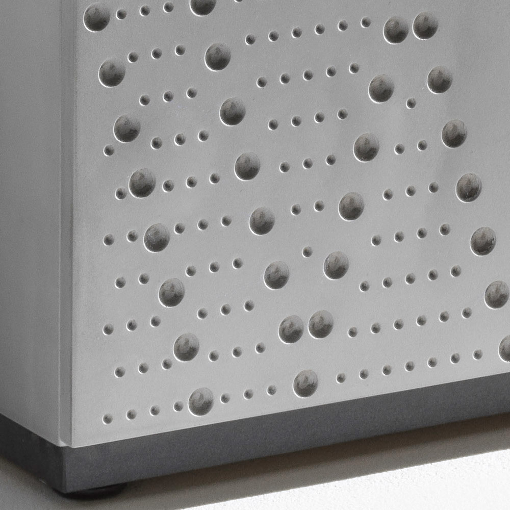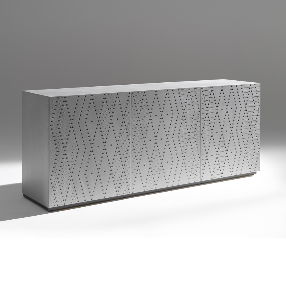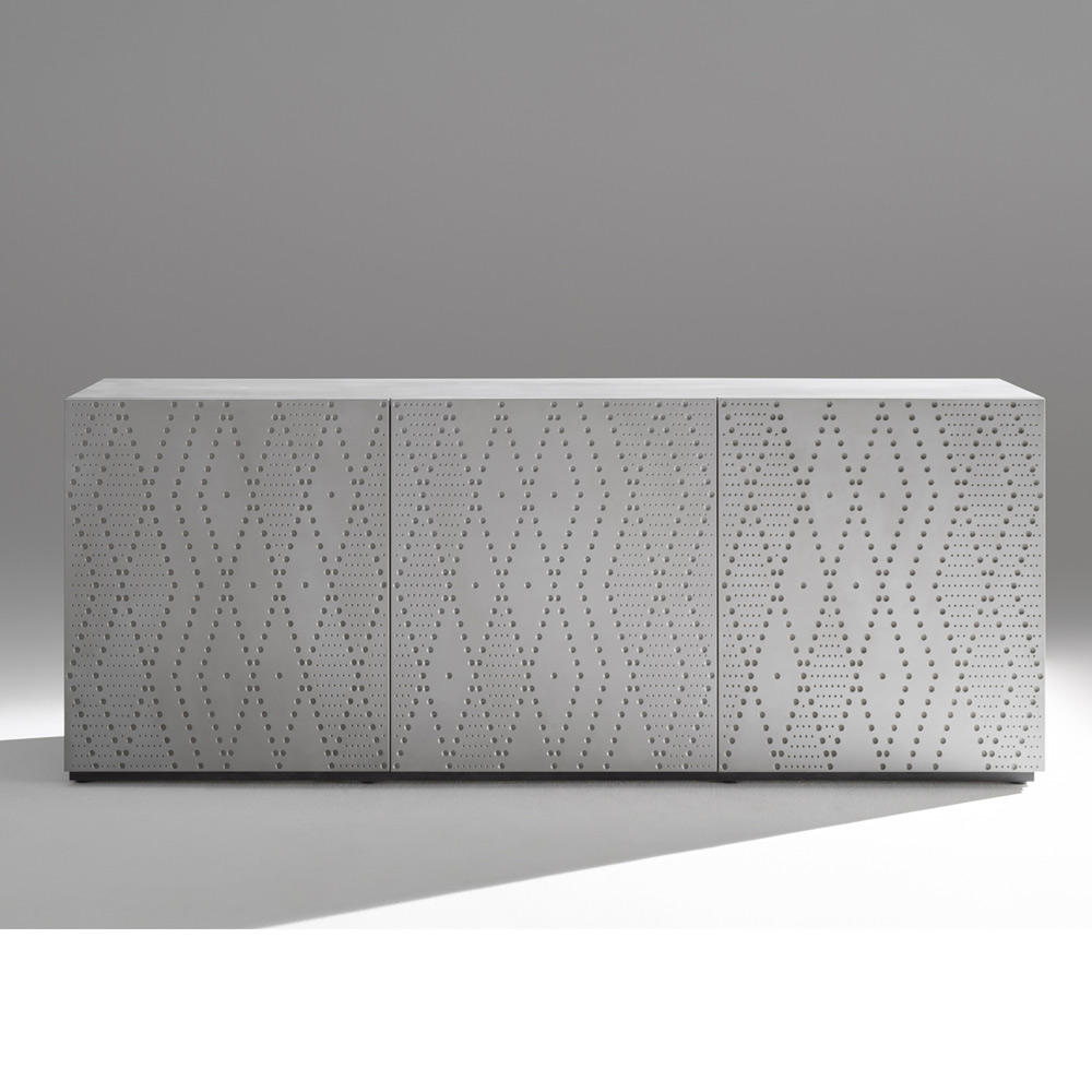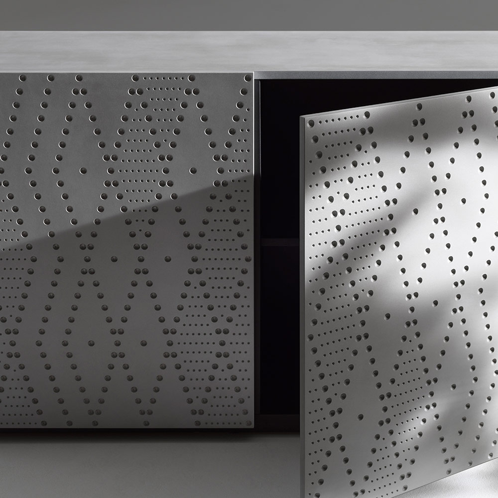 Un buffet à l'allure contemporaine et texturée, caractérisé par un décor raffiné en aluminium moucheté, évoquant la fonderie, qui habille les portes et crée un jeu sophistiqué de lumière et de profondeur. Une pièce spectaculaire conçue pour les espaces modernes, élégants et raffinés.