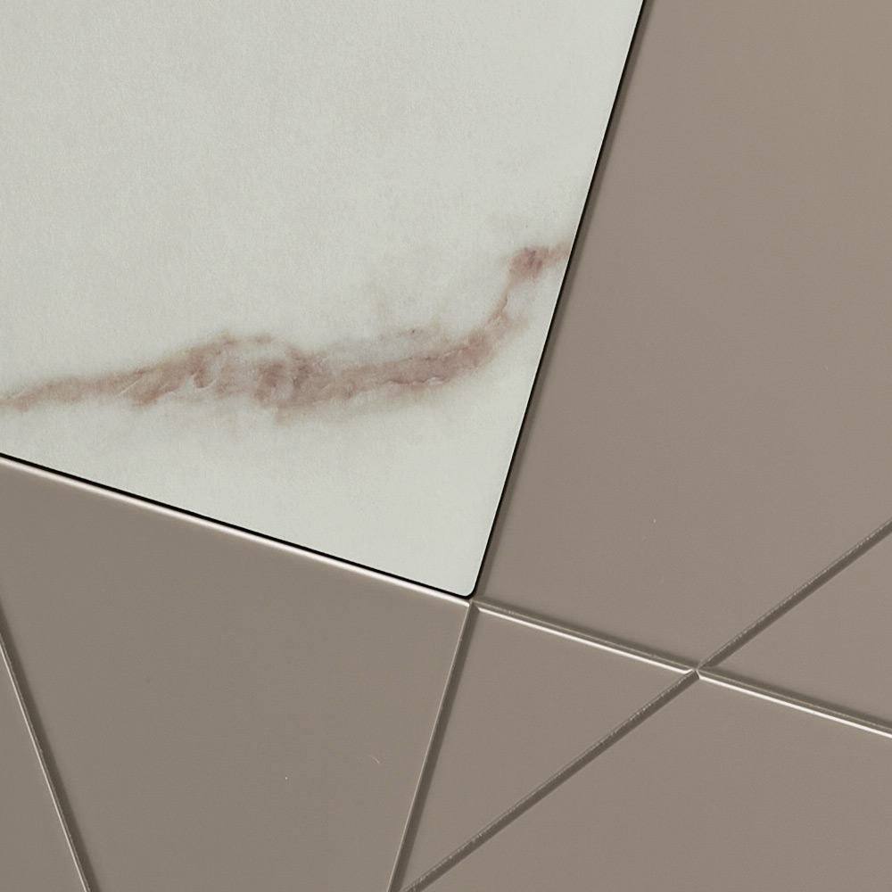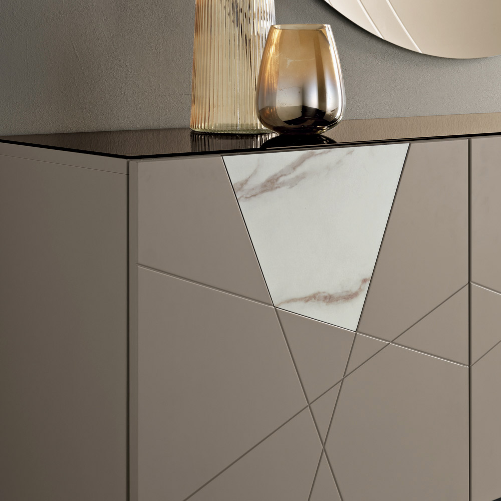 La structure se compose d' une enveloppe en bois mélaminé, d'un plateau en verre miroir et de portes en MDF pantographié, ornées de gravures décoratives s'entremêlant en un élégant motif géométrique. Des inserts en verre effet marbre rehaussent la surface, créant un jeu subtil de graphismes et de matières.