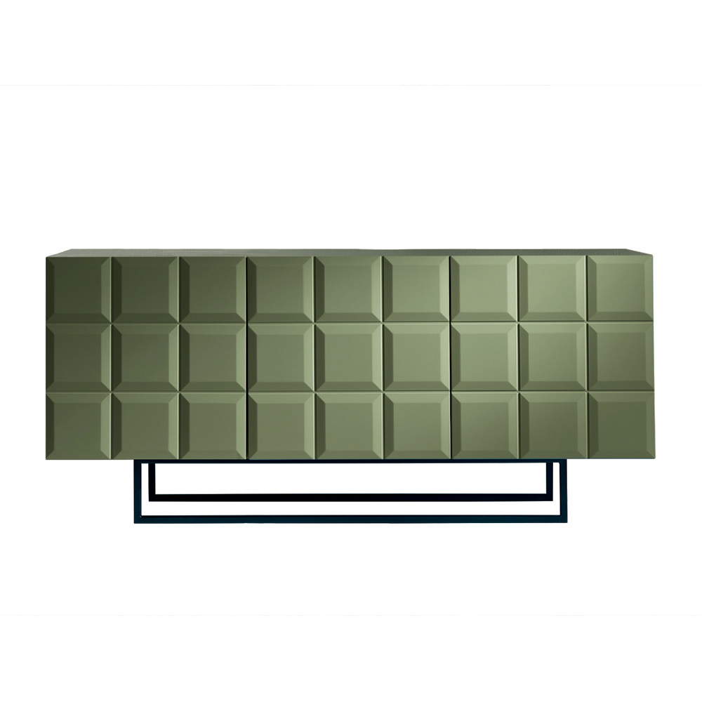 Le corps en mélamine s'associe à un piètement en métal peint , disponible en plusieurs configurations, qui affine la structure et lui confère une impression de légèreté. Le buffet peut être complété par un plateau en verre miroir pour un effet encore plus sophistiqué.