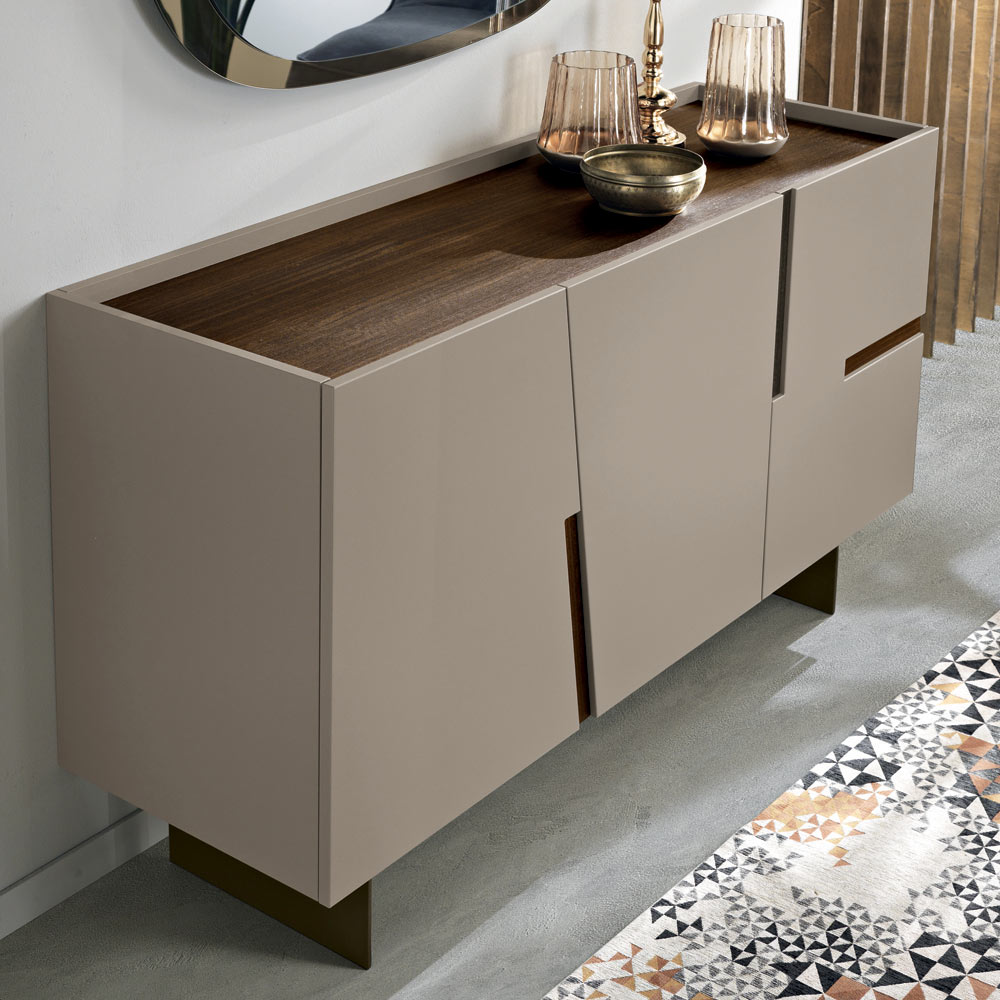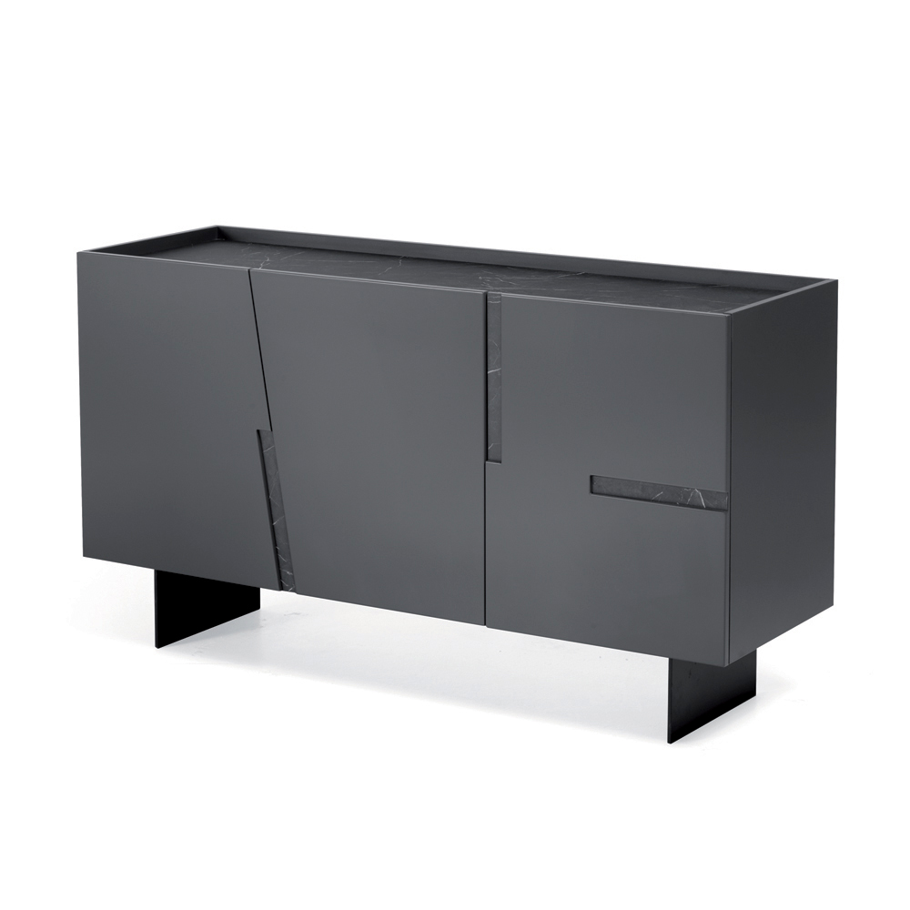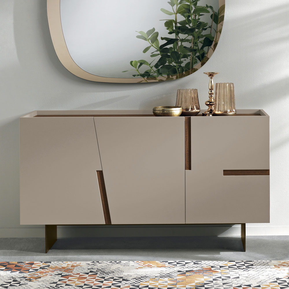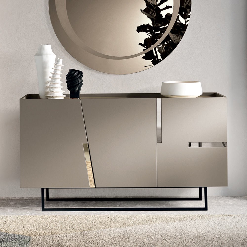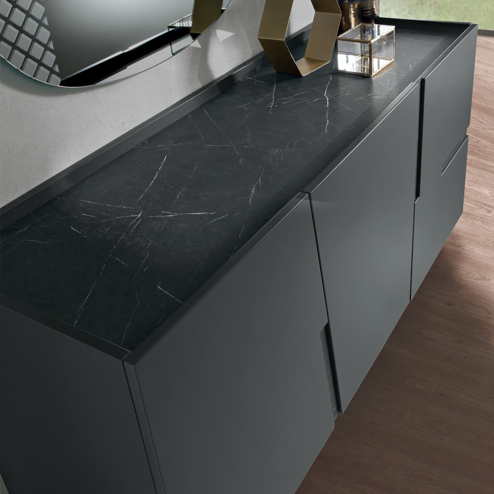 La structure est composée d' un corps en mélaminé et de portes en MDF laqué , créant ainsi une surface uniforme et élégante. Le design est rehaussé d' inserts décoratifs et de plateaux contrastés , disponibles dans des finitions telles que l'effet marbre , l'effet teck ou le miroir bronze , qui confèrent profondeur et caractère à l'ensemble.