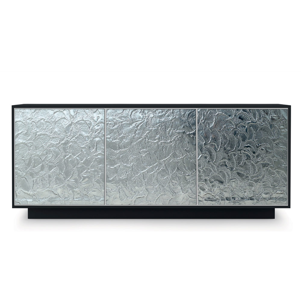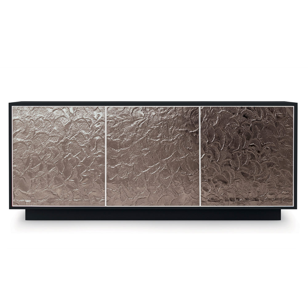 Buffet de salon entièrement fabriqué en Italie avec structure de plinthe et baseen bois laqué noir mat , 2 ou 3 portes avec profilé en aluminium et façades en verre travaillé équipées d' un système d'ouverture push&pull et étagères internes en verre trempé transparent (épaisseur 6 mm, charge maximale 20 kg). Son esthétique naît de la volonté d'allier fonctionnalité et élégance pour un résultat avec une personnalité moderne et un fort impact scénographique , idéal pour ceux qui aiment un style d'ameublement raffiné et avant-gardiste . La combinaison parfaite de l'élégance intemporelle du verre et de sa fabrication originale avec la touche imposante du bois donne un complément au design luxueux capable de caractériser chaque pièce de la maison avec une touche de style exclusif .