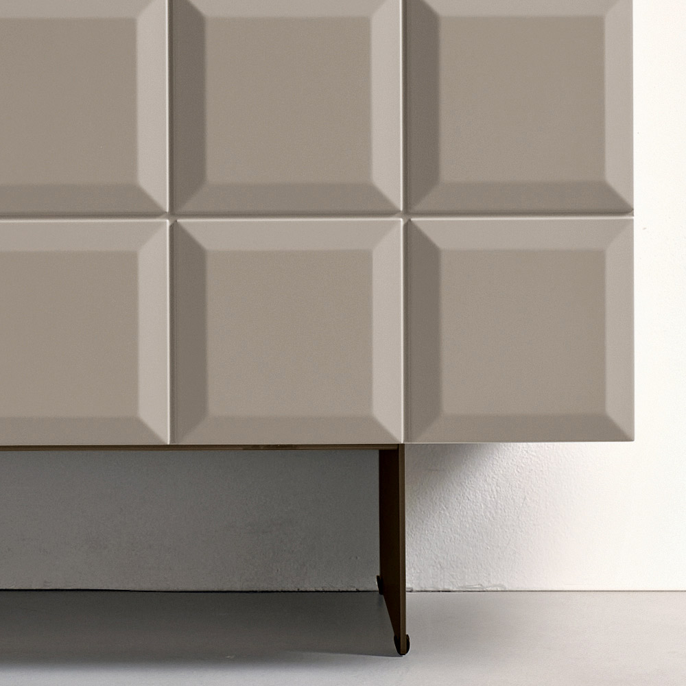 Les portes en MDF recouvertes de PVC laqué se caractérisent par une grille géométrique en relief qui évoque une composition modulaire raffinée, créant un élégant jeu d'ombre et de lumière et donnant de la profondeur à la surface.