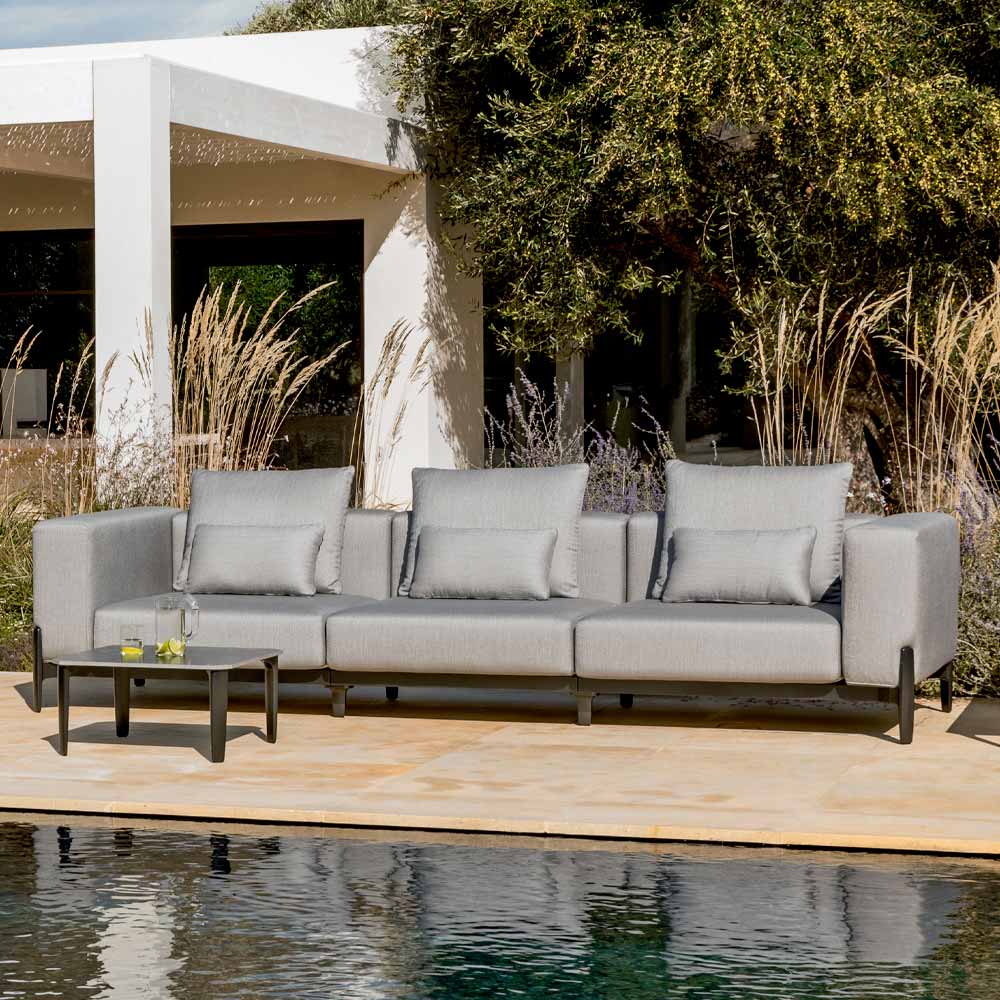 Canapé design d'extérieur 3 places en aluminium et coussins en tissu imperméable, de haute qualité fabriqué en Italie.