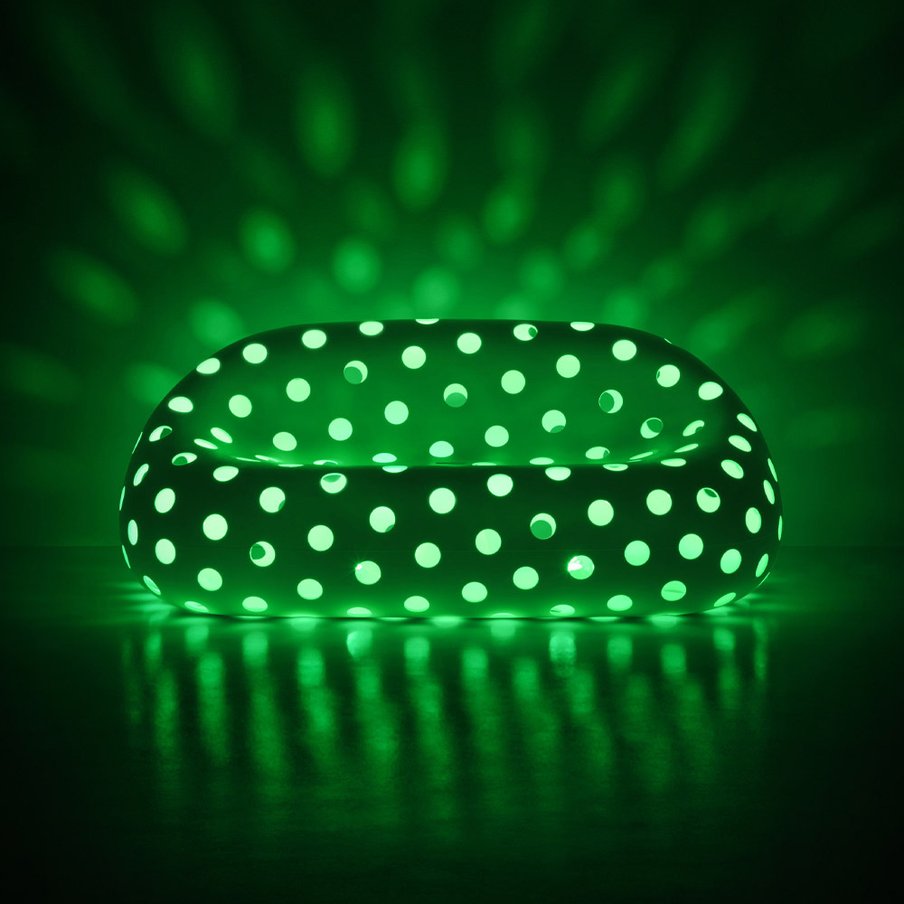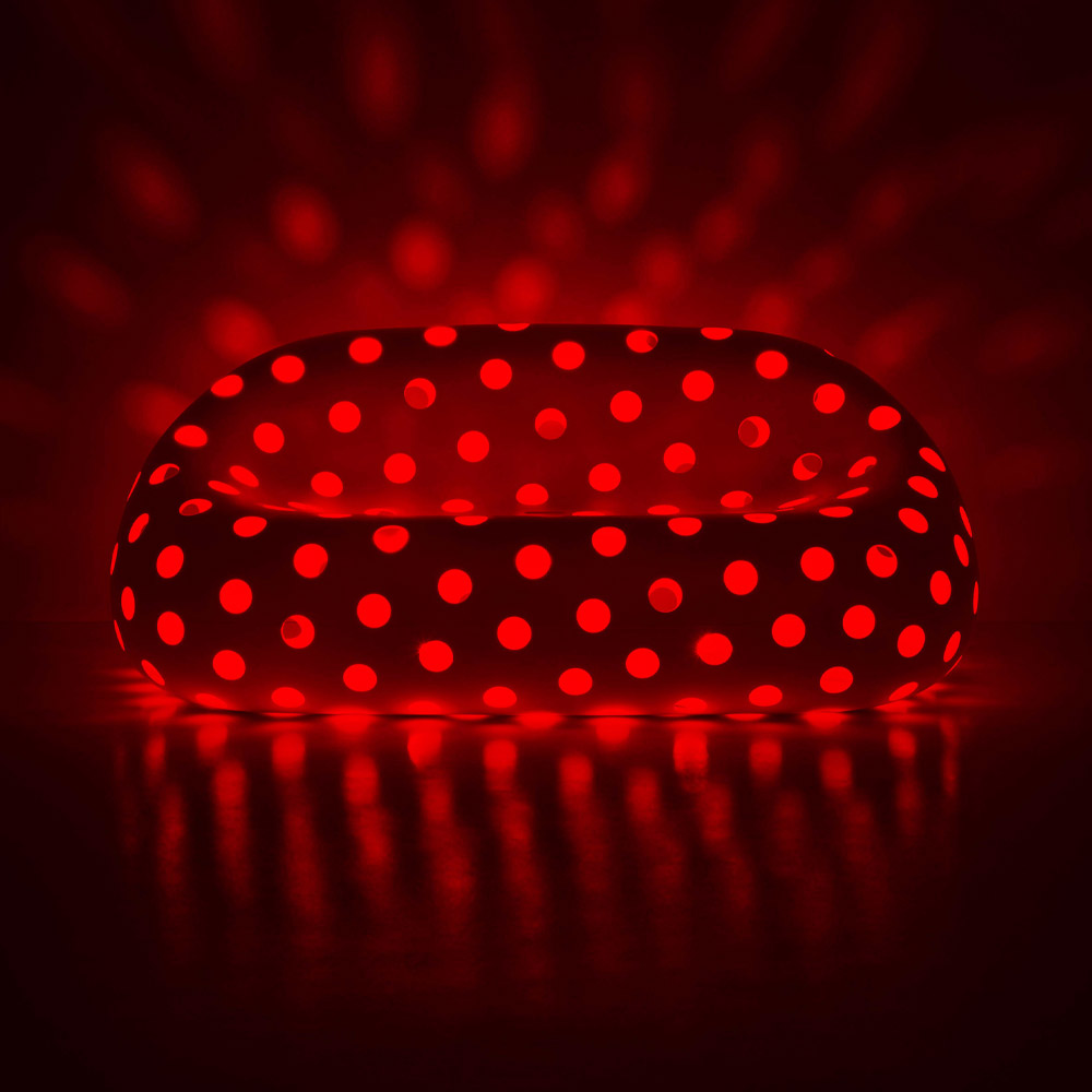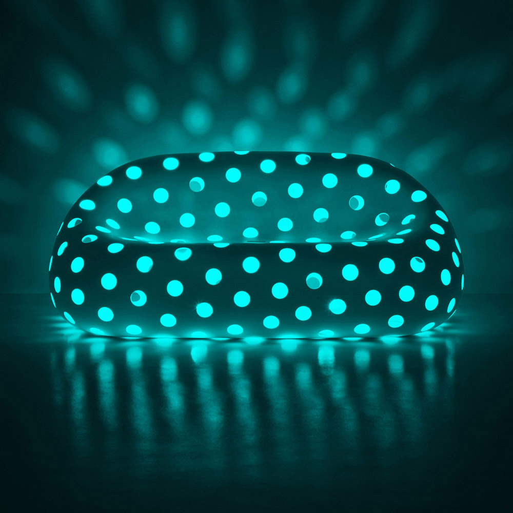 La surface perforée donne une légèreté sans précédent au canapé, créant des jeux de lumière spectaculaires grâce à la source lumineuse insérée à l'intérieur.