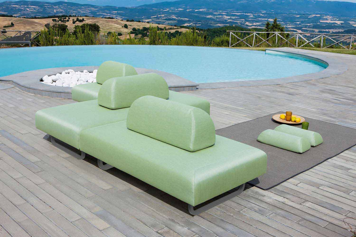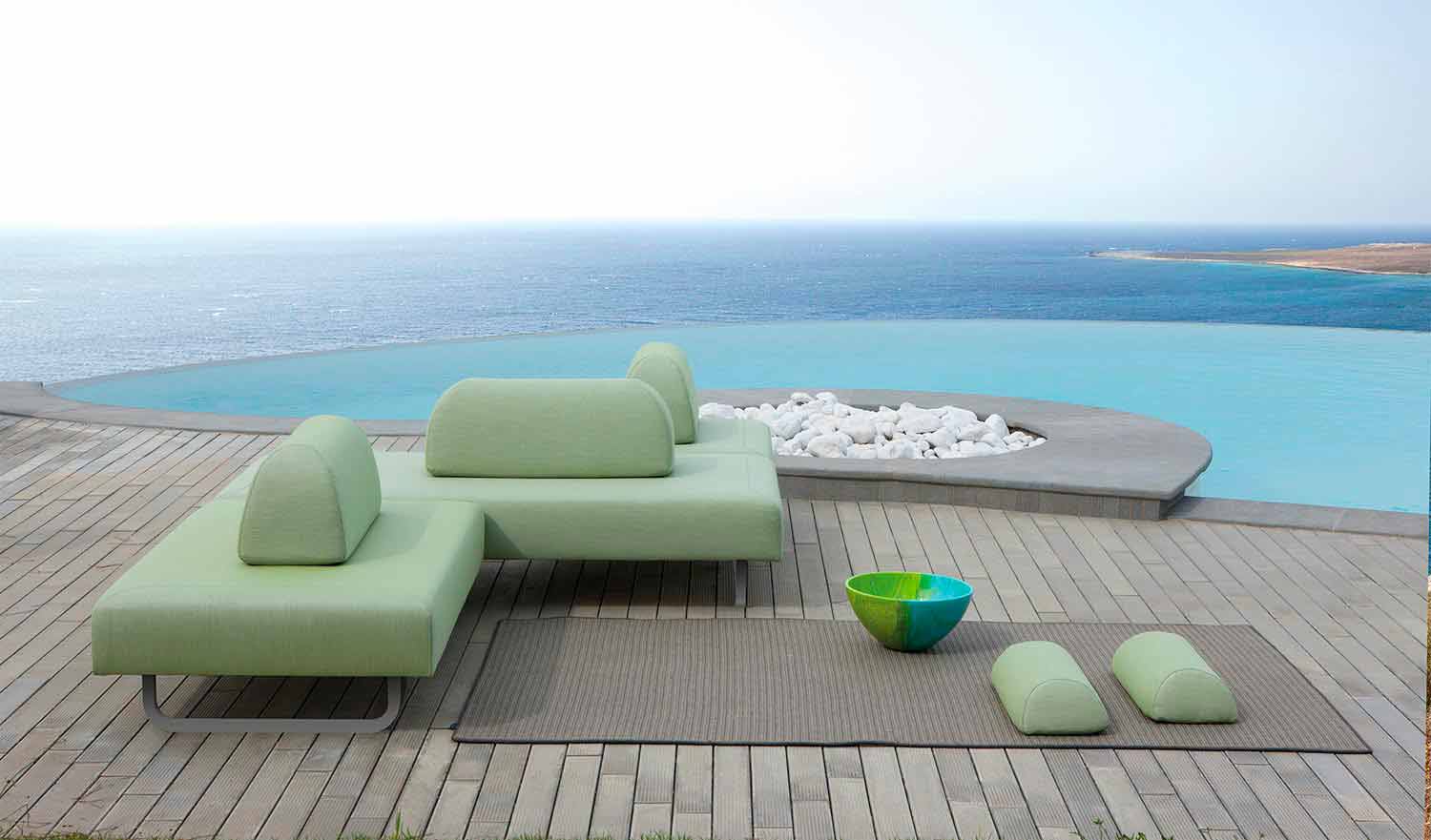 Sa structure interne est en bois résistant et son rembourrage est recouvert d'un tissu d'extérieur 100 % acrylique teinté, utilisé précisément pour sa résistance aux agents atmosphériques , aux taches, aux moisissures et aux rayons UV. Les pieds sont en fer galvanisé thermolaqué et peint avec une poudre thermodurcissable en finition mate. Idéal pour l'extérieur comme pour l'intérieur. Couleurs des sièges :