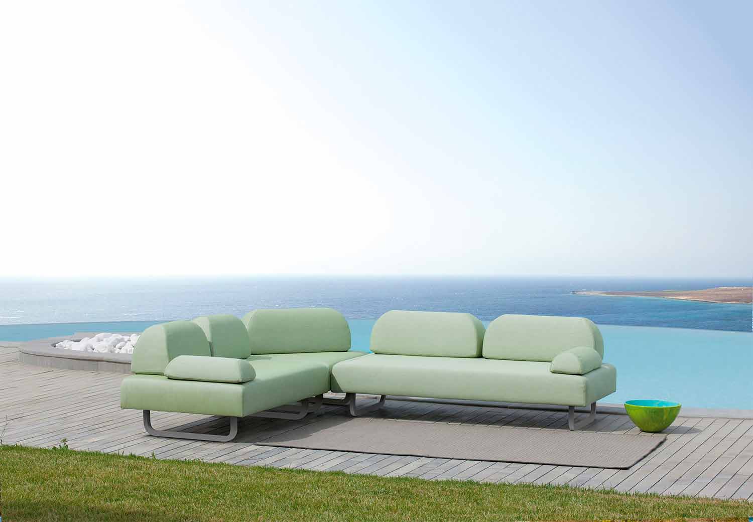 Canapé d'extérieur trois places design en fer galvanisé thermolaqué et tissu acrylique 100% teinté Fabriqué en Italie.