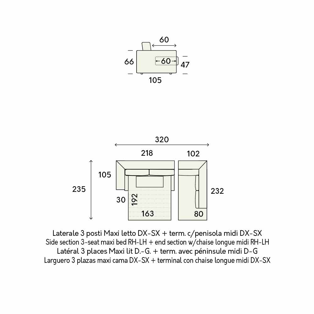 - L 320 x P 235 x H 85 cm (matelas: L 163 x P 192 x H 11 cm).