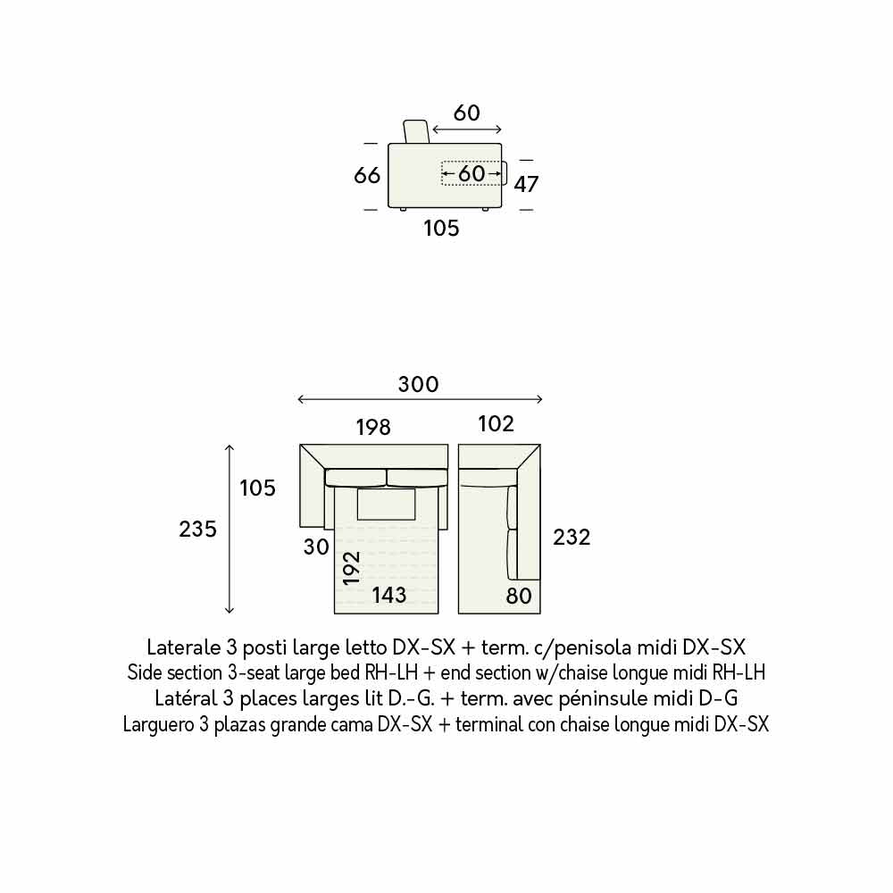 - L 300 x P 235 x H 85 cm (matelas: L 143 x P 192 x H 11 cm):