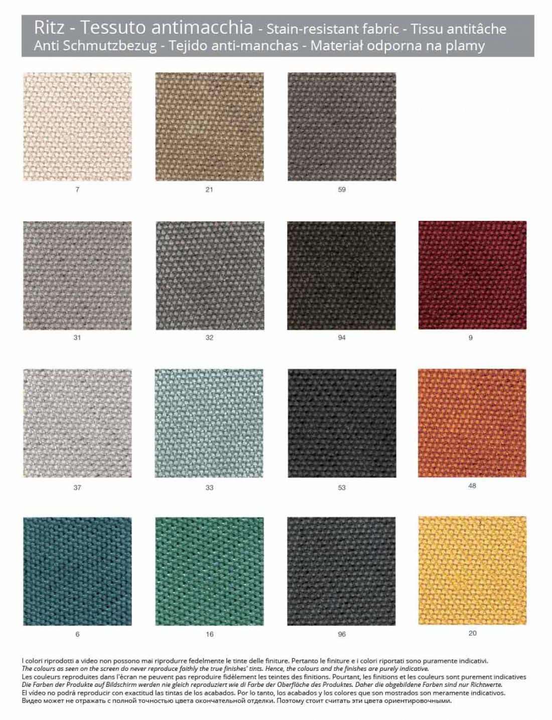 - Tissu antitaches Ritz; Ritz est un tissu agrèable au touché, sélectionné comme revêtement pour ces fauteuils grâce a sa caractéristique résistance à l'usure. C'est un tissu antitaches composé par 86% Polyester, 14% Polyamide.