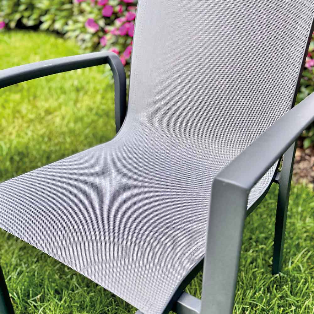 La structure en aluminium peint est solide mais légère, résistante à la rouille et aux intempéries, parfaite pour vivre en extérieur sans souci. L'assise et le dossier en textilène , un tissu technique respirant et souple, garantissent un confort ergonomique même après des heures d'utilisation, s'adaptant parfaitement à la morphologie.