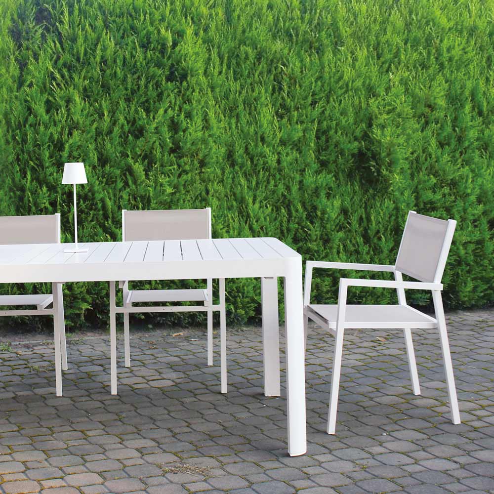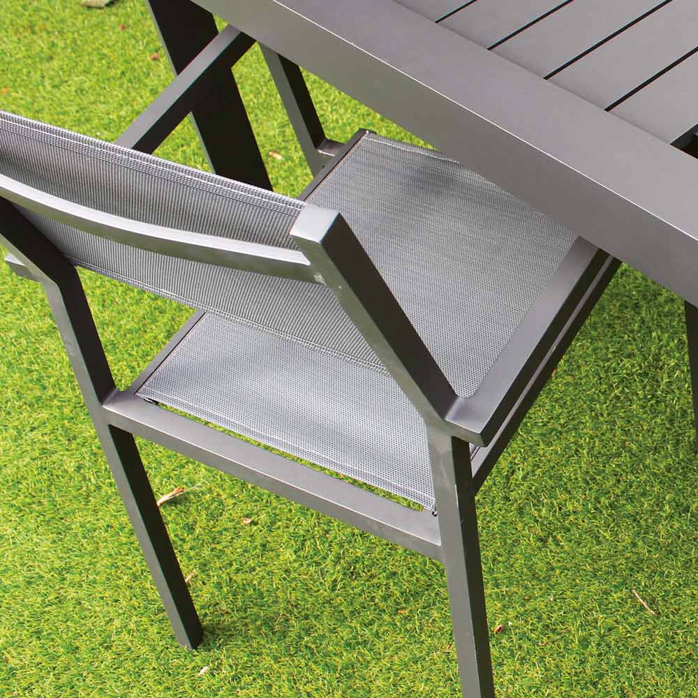L'assise et le dossier en textilène , un matériau technique respirant et confortable, garantissent une assise ergonomique et agréable, même lors des journées les plus chaudes. Sa couleur confère à la chaise une élégance sobre , parfaite pour accompagner les tables basses ou les tables de salle à manger dans les jardins, les terrasses ou les espaces professionnels.