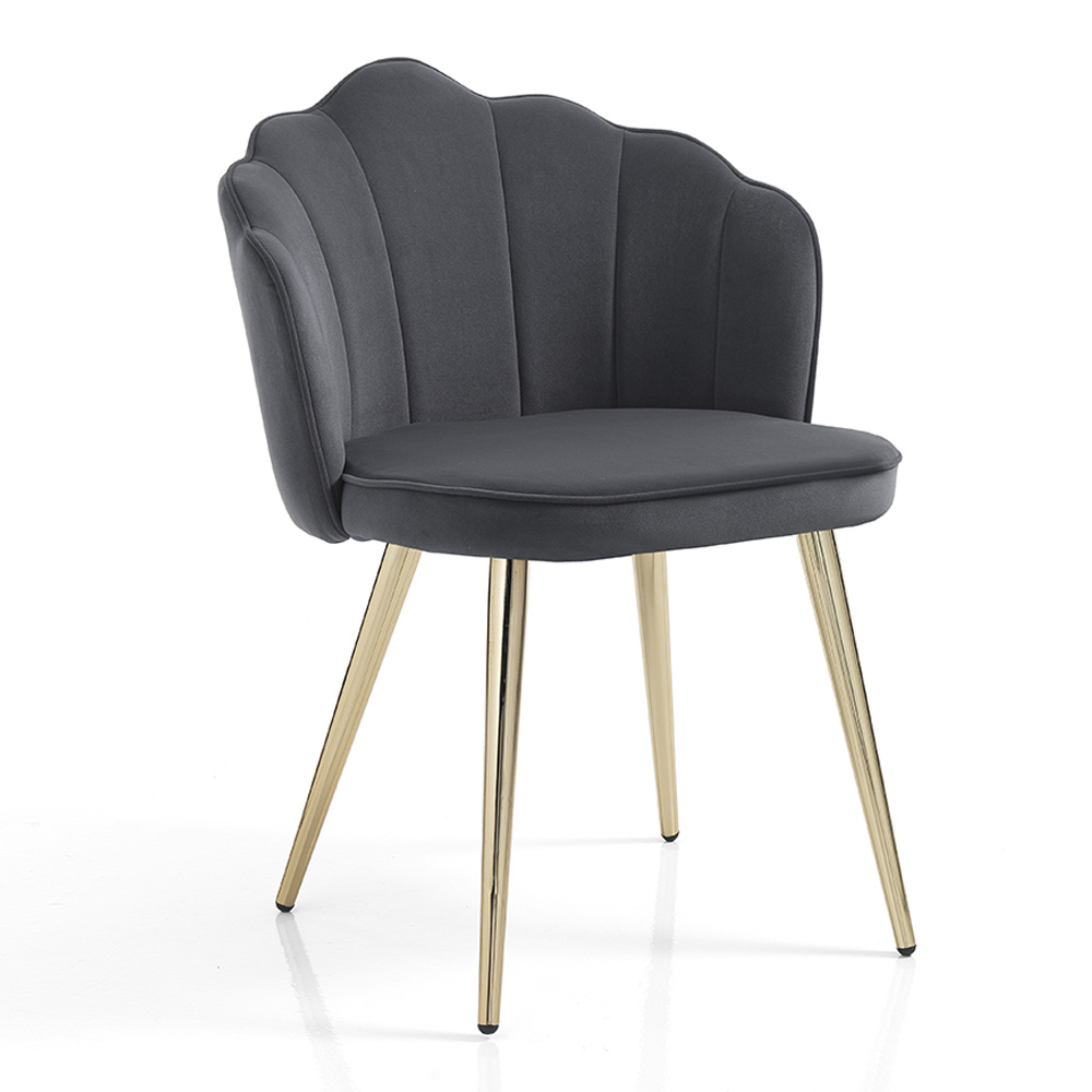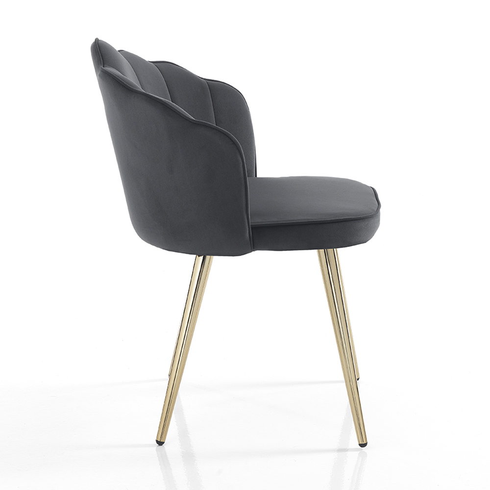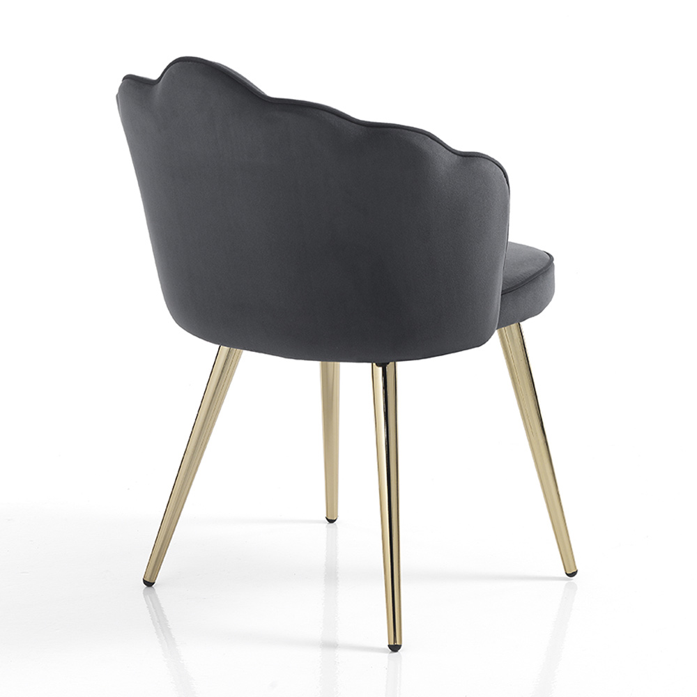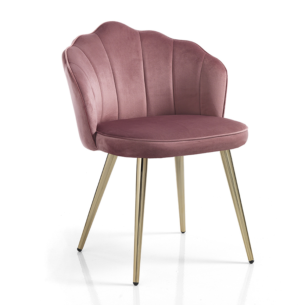 Chaise de salle à manger avec assise rembourrée recouverte d'un tissu effet velours doux et pieds en métal peint avec une finition dorée brillante . Un meuble au design original caractérisé par une combinaison de finitions et de couleurs qui soulignent l'élégance de la chaise. Sa forme inhabituelle et son âme romantique offrent une assise particulièrement confortable et enveloppante, simulant la sensation d'une étreinte chaleureuse et permettant à ceux qui s'assoient de profiter de merveilleux moments dédiés à la détente.