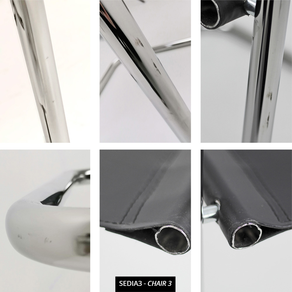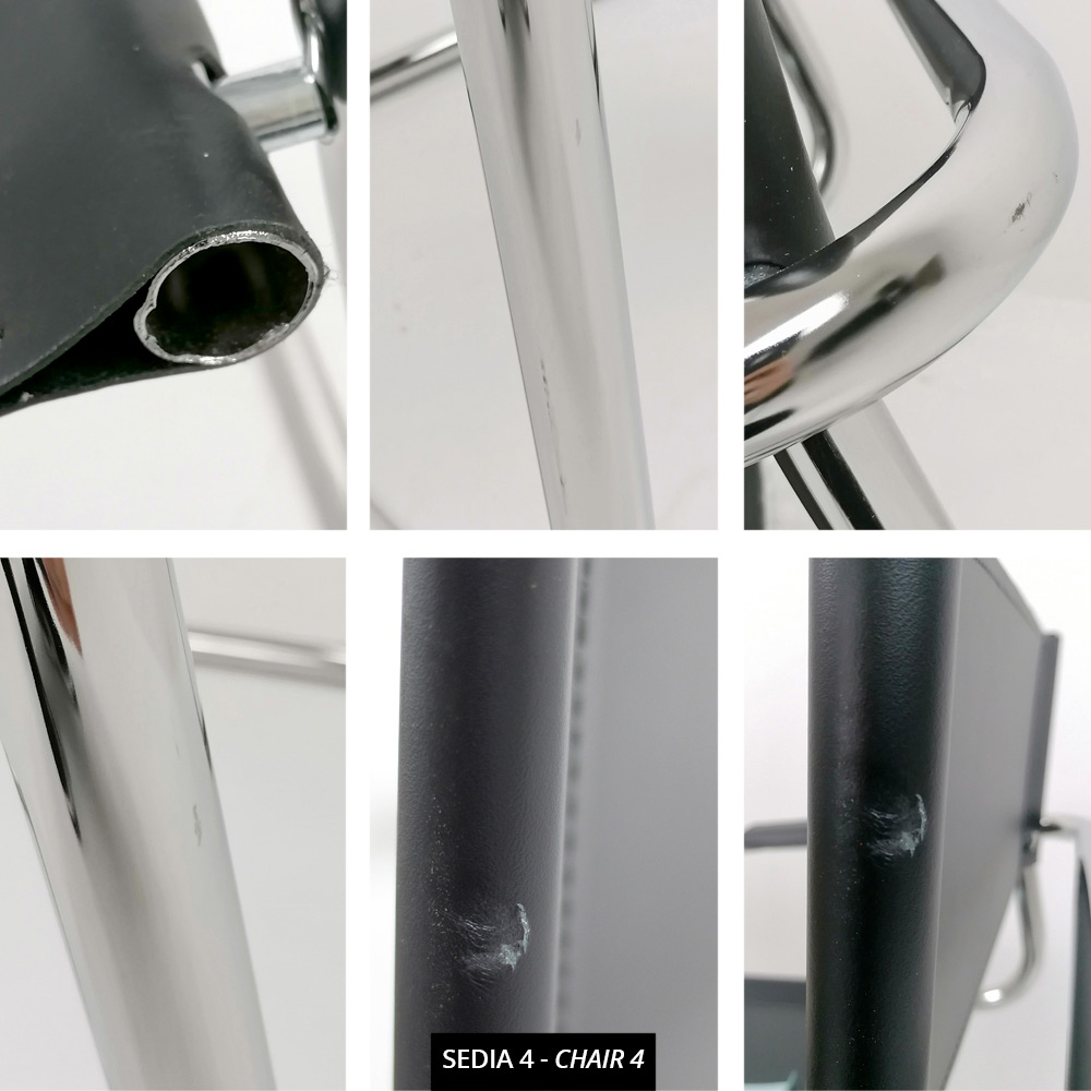 Chaise moderne pour salle de réunion ou salle de conférence, en métal chromé et cuir reconstitué noir.