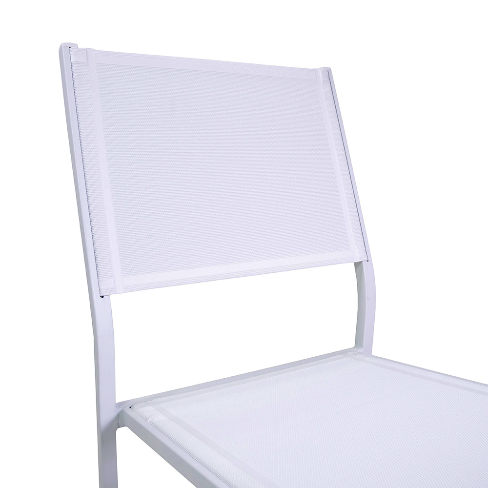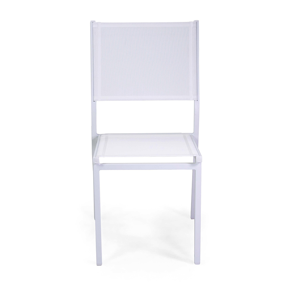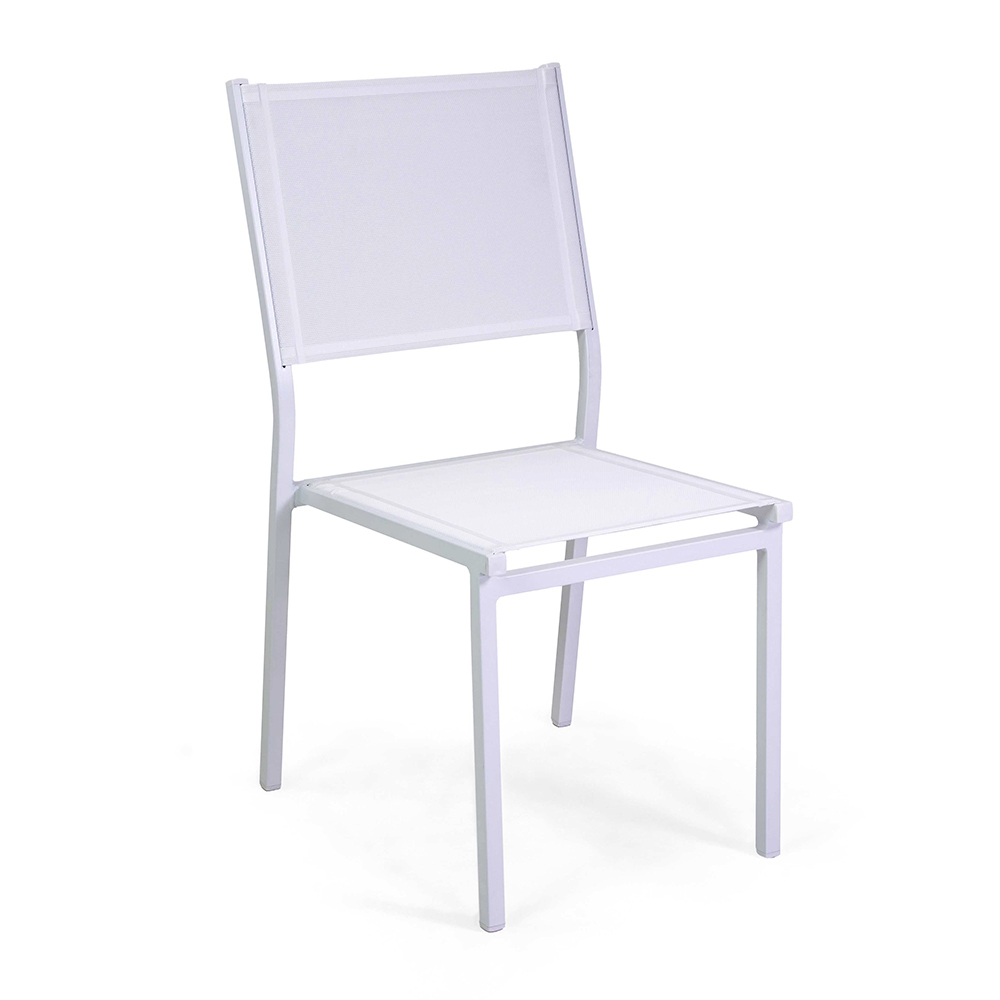 Cette chaise avec une structure en aluminium thermolaqué blanc représente l'équilibre idéal entre fonctionnalité et style, parfait pour les environnements extérieurs tels que les jardins et les terrasses. Le textilene blanc lui confère non seulement un look moderne et élégant, mais assure également une assise confortable et résistante aux intempéries.