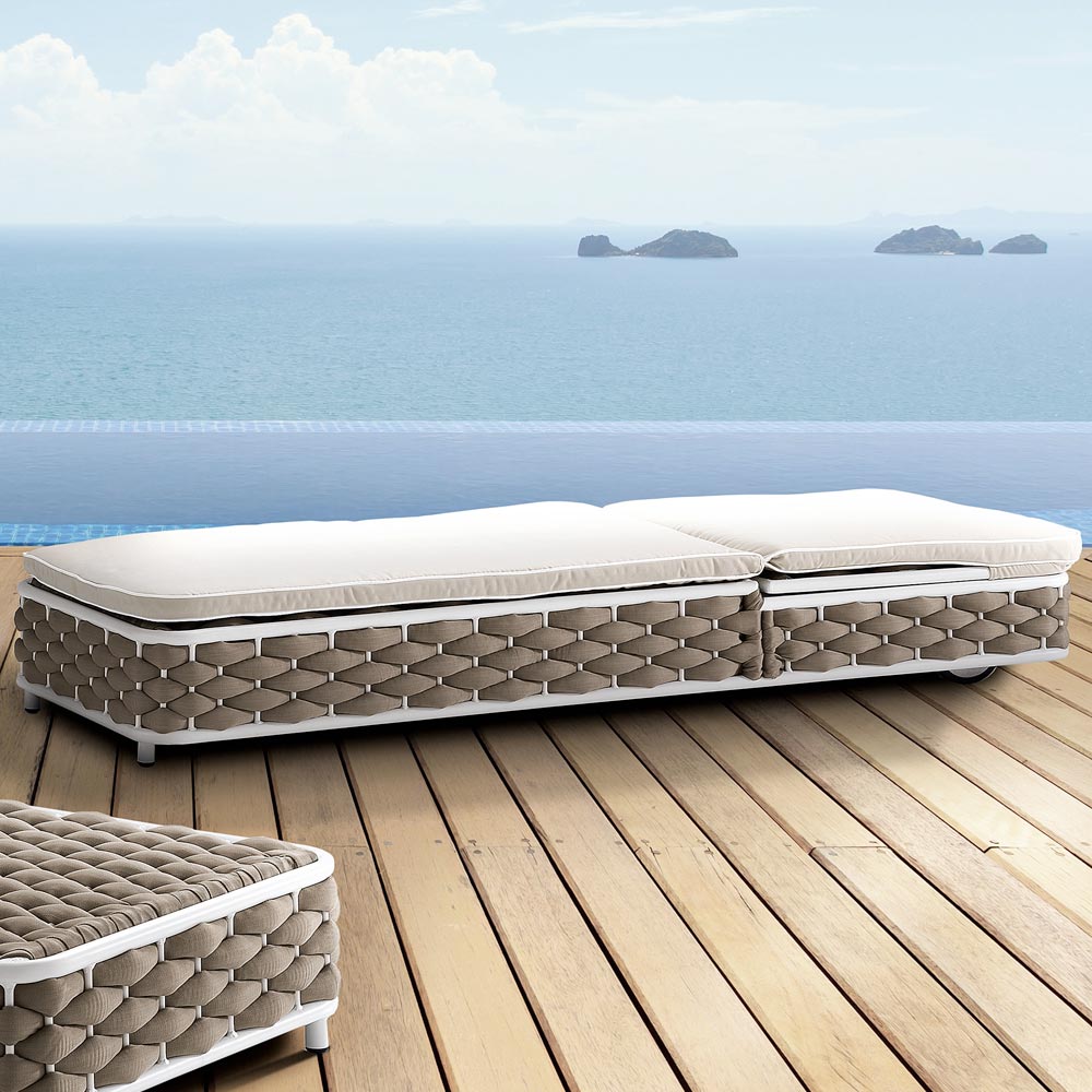 aluminium laqué blanc et son tissu tubulaire Olefin tissé à la main, un matériau spécifique pour l'extérieur, rembourré avec du polyuréthane. Le