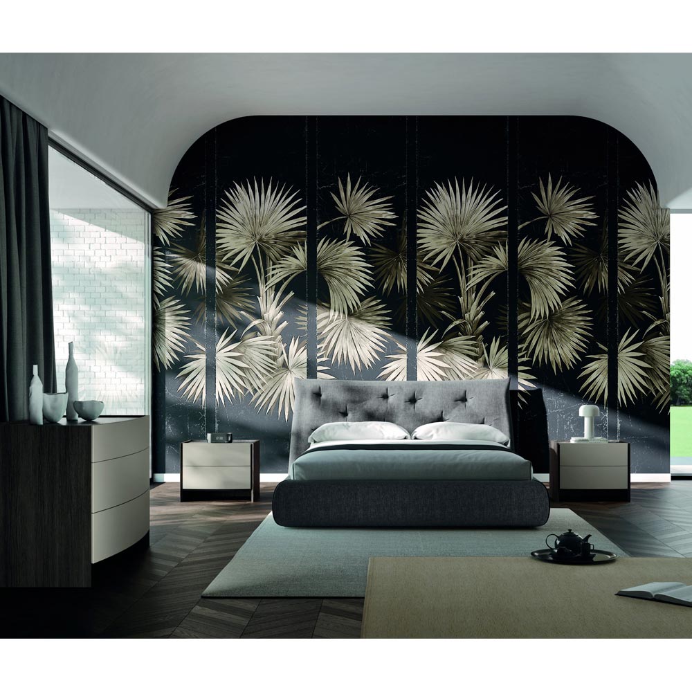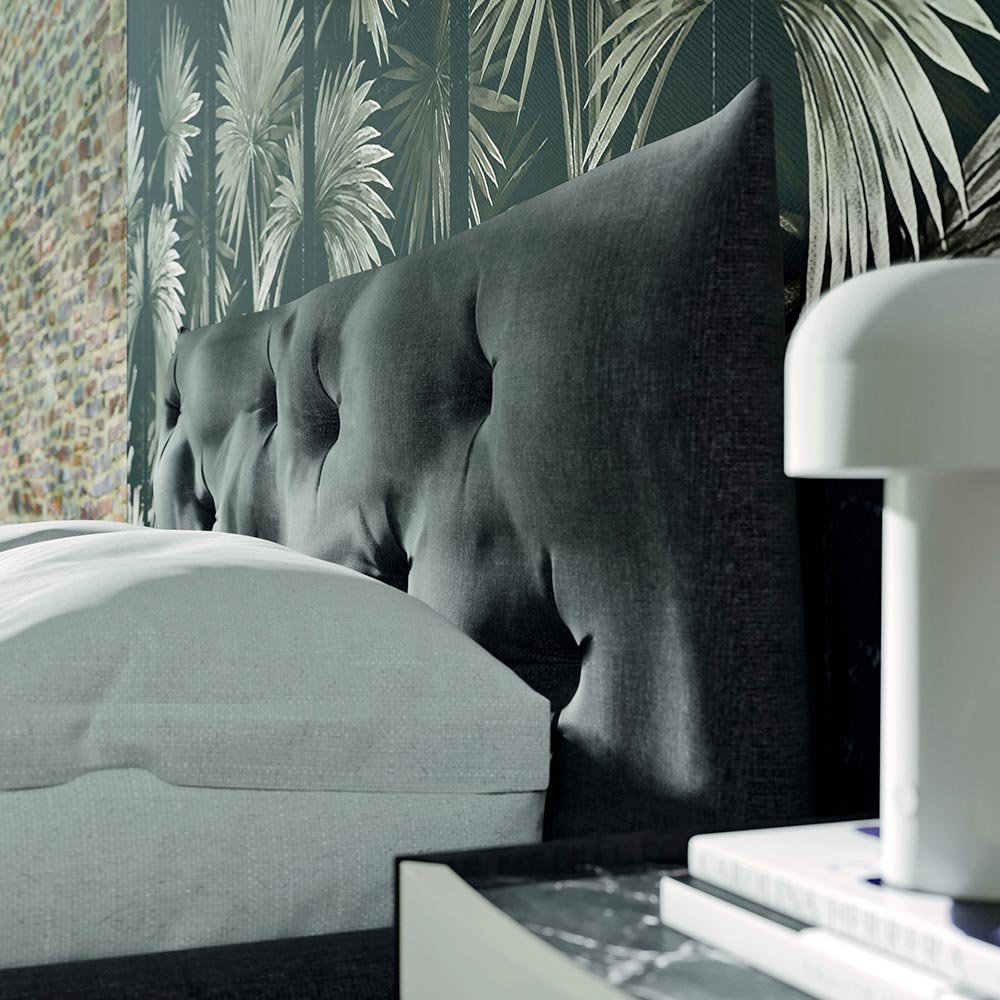 présence importante et imposante et par le traitement particulier qui déplace la douceur de la tête de lit, conquérant la zone de couchage avec sa