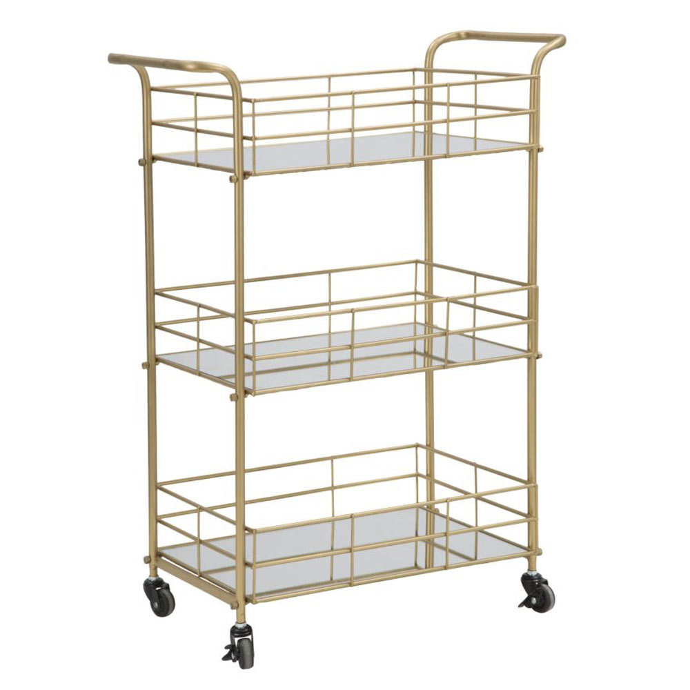 Chariot à nourriture avec structure en fer finition doréeet 3 étagères en miroir avec roues. Un design simple,élégant et fonctionnel idéal pour les espaces domestiques tels que les salles à manger ou les cuisines modernes où il est pratique et utile et en même temps parfait pour compléter le mobilier avec une touche fantaisiste et captivante .