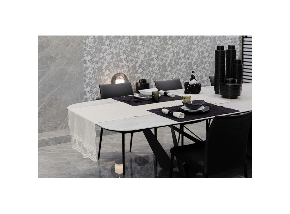 Chemin de table en lin blanc pur avec deux variantes de décoration en dentelle, design élégant et luxueux fabriqué en Italie.