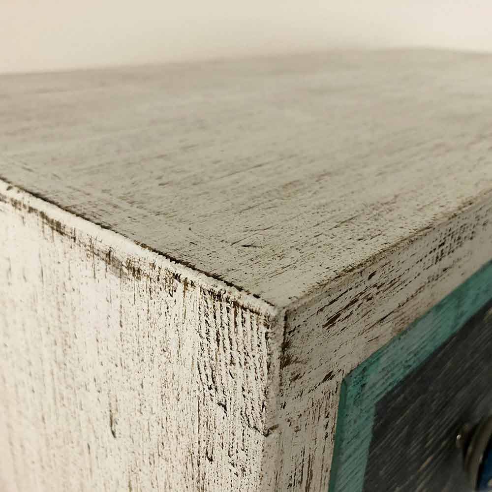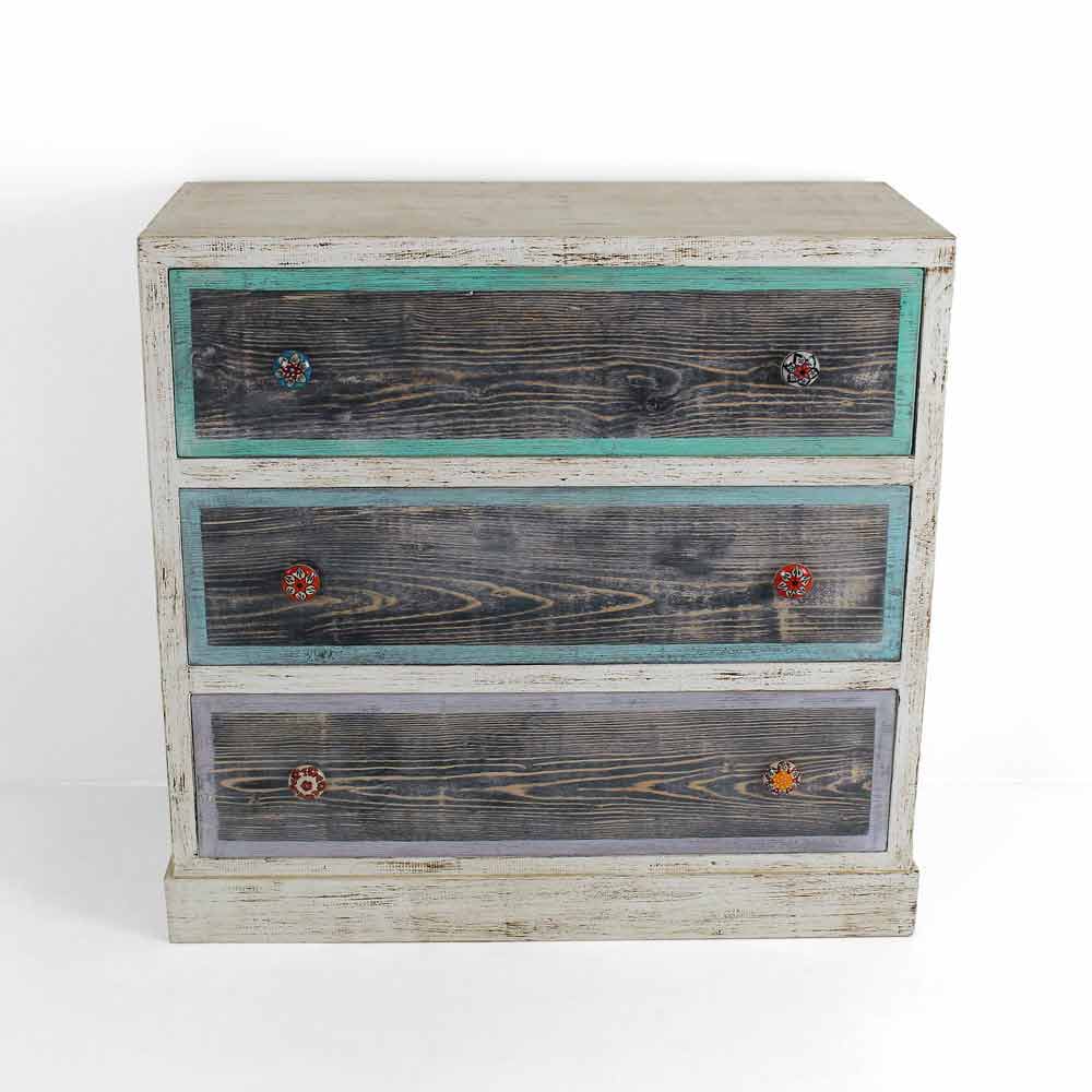 Commode artisanale fabriquée en Italie en bois de sapin massif avec 3 tiroirs en contreplaqué de peuplier avec façade en bois peint à la main et boutons en céramique. La structure du produit a une finition blanche vieillie tandis que les tiroirs sont décorés en noir écorché avec des bords colorés. Ces merveilleuses couleurs sont obtenues grâce à l'utilisation de terres naturelles agrégées avec des colles d'origine animale, matériaux choisis comme alternative aux peintures industrielles courantes. Ceci est fait dans une tentative de minimiser l'utilisation de formaldéhyde, une substance nocive reconnue comme cancérigène. De cette manière, il est possible d'abaisser le niveau de toxicité, créant ainsi un produit fonctionnel et fascinant et une atmosphère plus saine. La commode est enfin complétée par une finition transparente qui la rend hydrofuge et fixe les couleurs pour les rendre immuables dans le temps.