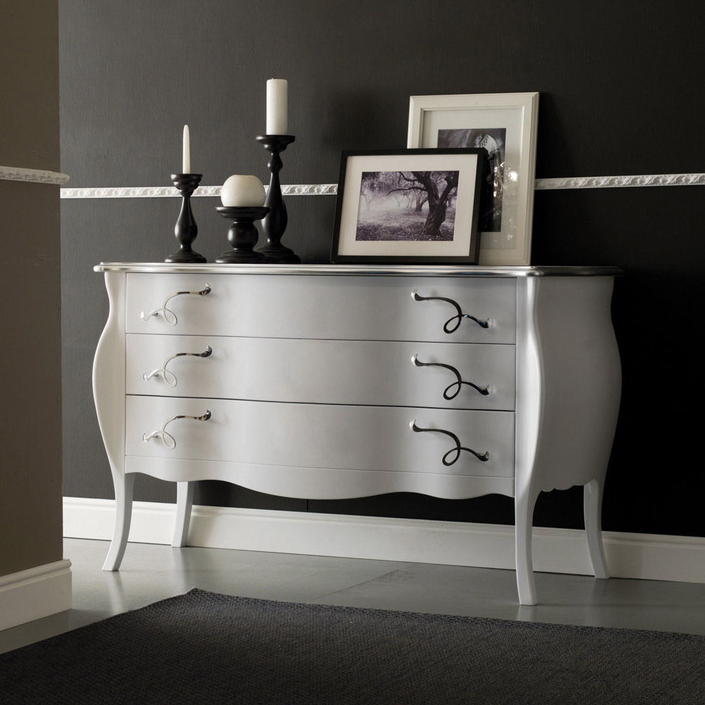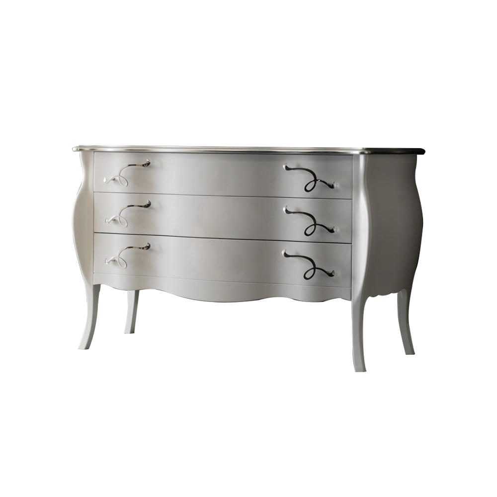 Commode réalisée en latté de Tilleul avec finition en nacre artisanale et guides rembourrés, composée de 3 tiroirs en relief nuancés argentés. Ce produit, grâce à ses finitions et ses lignes douces et sinueuses, acquiert tout le charme du style classique et élégant , devenant un élément parfait pour compléter et personnaliser l'environnement. La fonctionnalité et la capacité sont garanties par les tiroirs, dans lesquels ranger soigneusement divers objets, et par la surface sur laquelle ranger les objets utiles à la personne. Les maîtres artisans italiens s'engagent à prendre soin de chaque détail et à choisir les meilleurs matériaux pour garantir toute la qualité du Made in Italy.