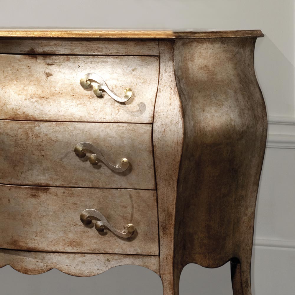 Commode en latté de Tilleulfinition feuille artisanale, composée de 3 tiroirs avec poignées en feuille d'argent mecque. Les artisans italiens experts dans le secteur ont apporté le plus grand soin et attention à la création de chaque détail et au choix des matériaux pour garantir toute la qualité d'un produit fabriqué en Italie. Les lignes douces et sinueuses et les finitions raffinées donnent vie à un élément capable de compléter et de personnaliser l'environnement, offrant au client une grande capacité et fonctionnalité.