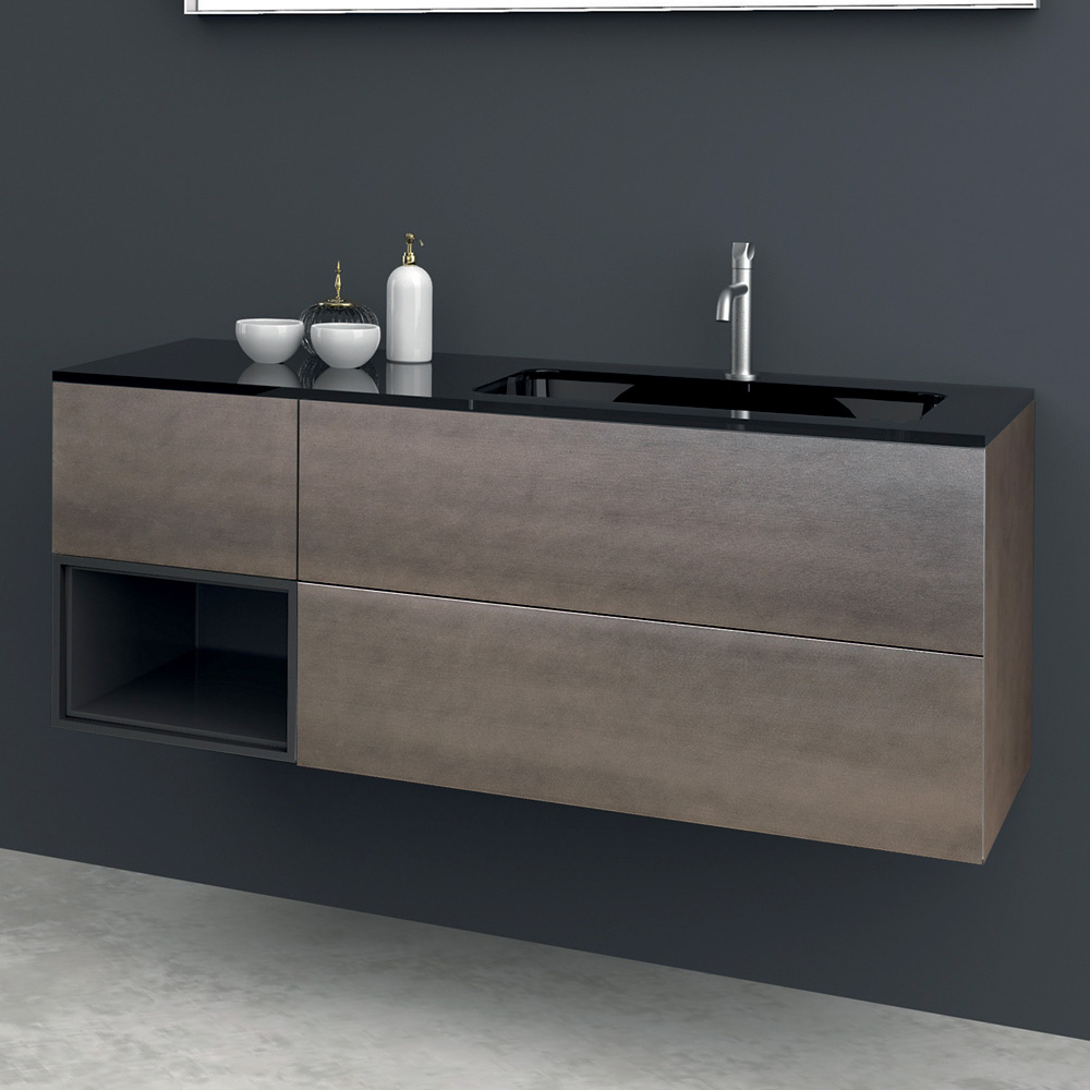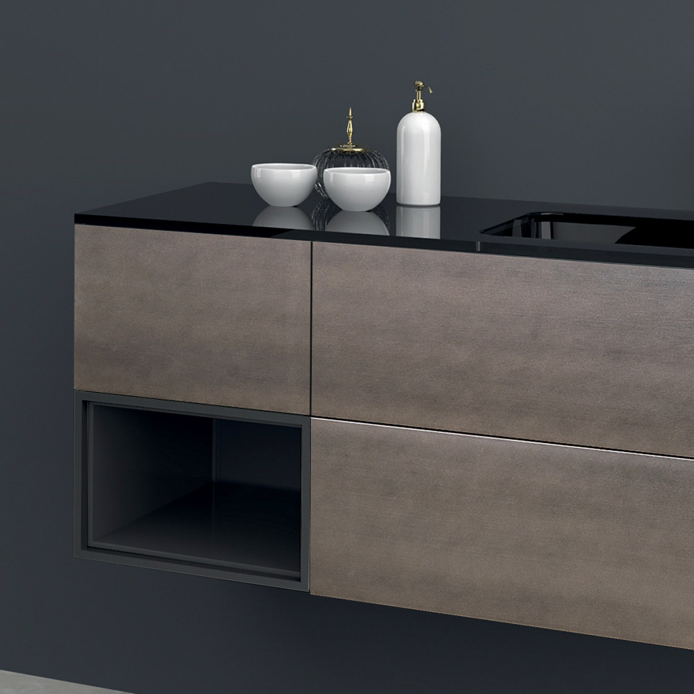 composition de mobilier de salle de bain se caractérise par la pureté des lignes et la finition très raffinée.