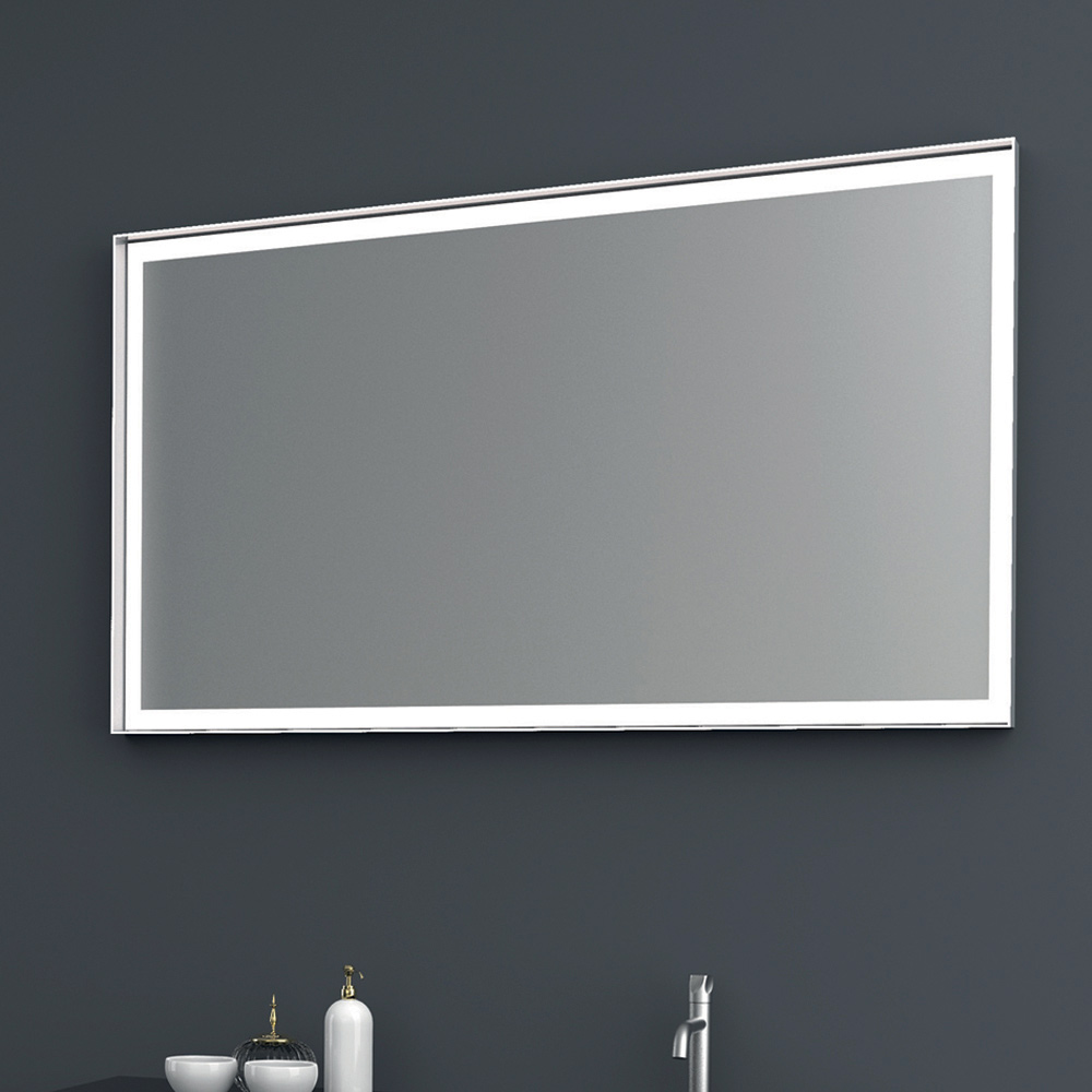 miroir sablé avec éclairage LED sur les 4 côtés associé à un cadre en métal peint en platine antique.