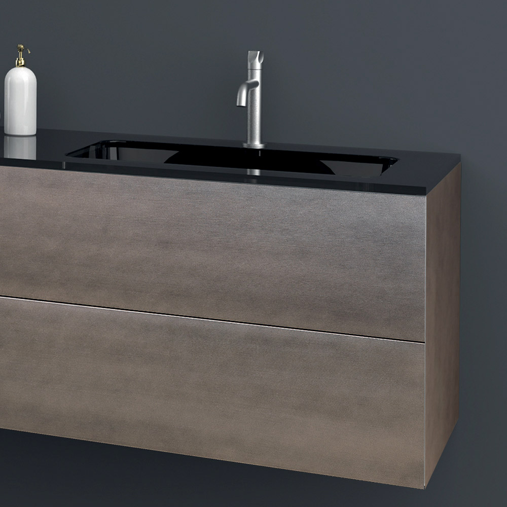 verre élégant et raffiné avec lavabo noir brillant intégré.