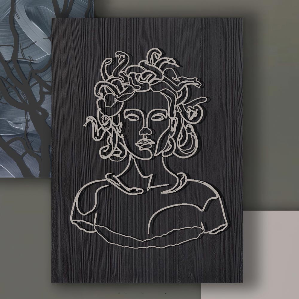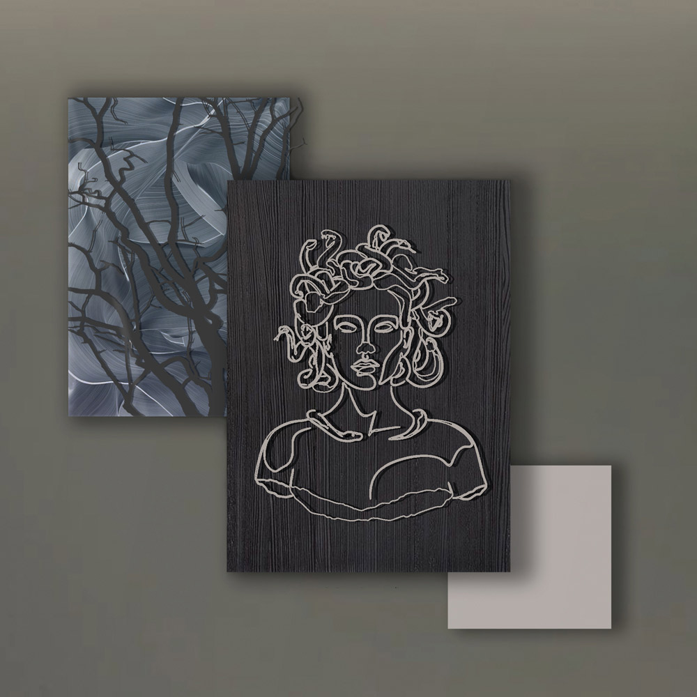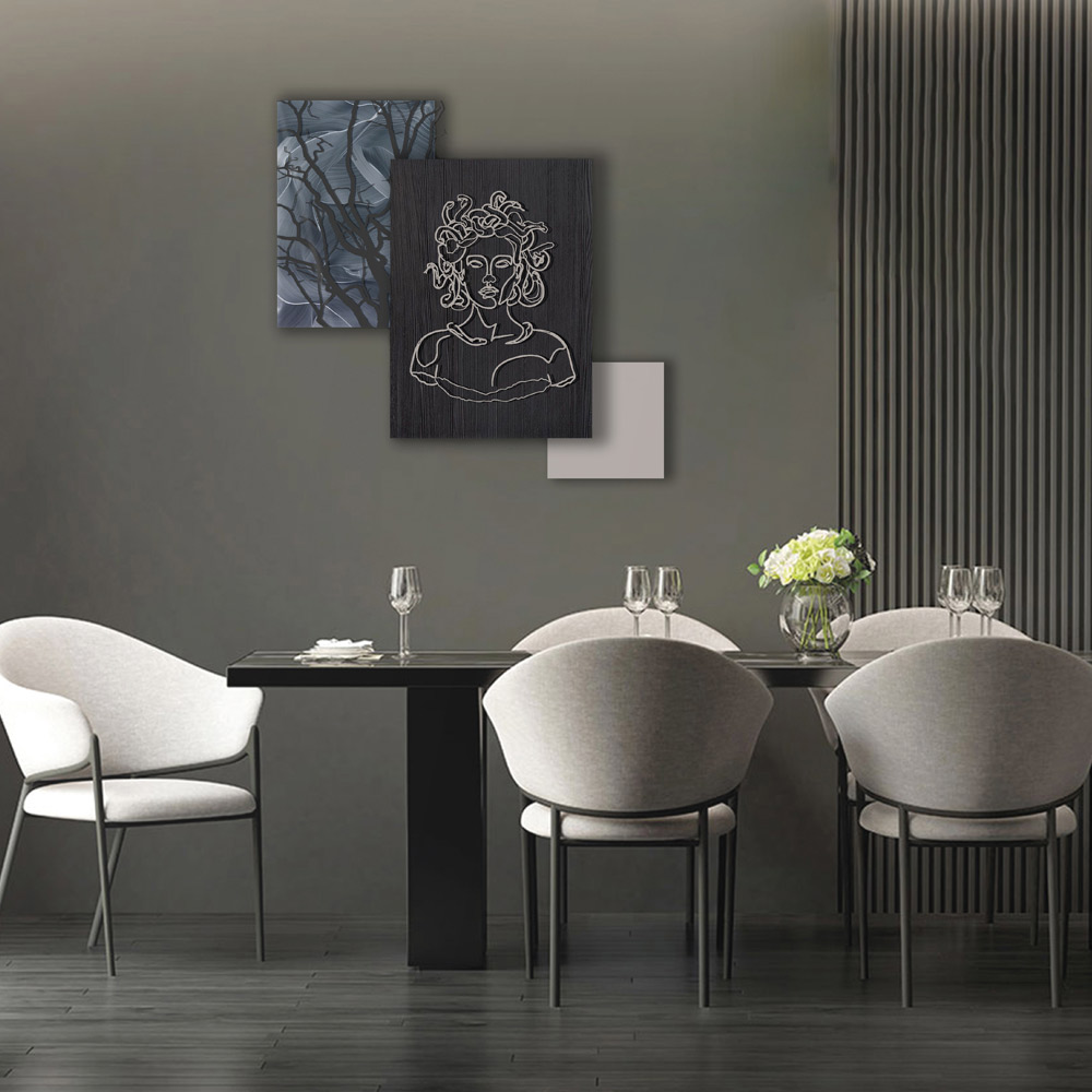 Composition de trois panneaux en bois imprimés représentant Medusa Made in Italy