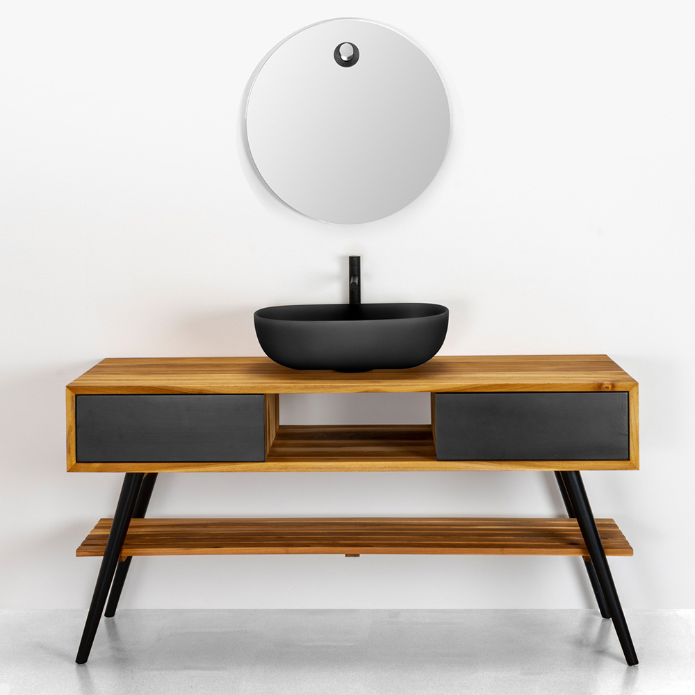 Composition de meuble de salle de bain avec miroir rond et vasque en résine noire.