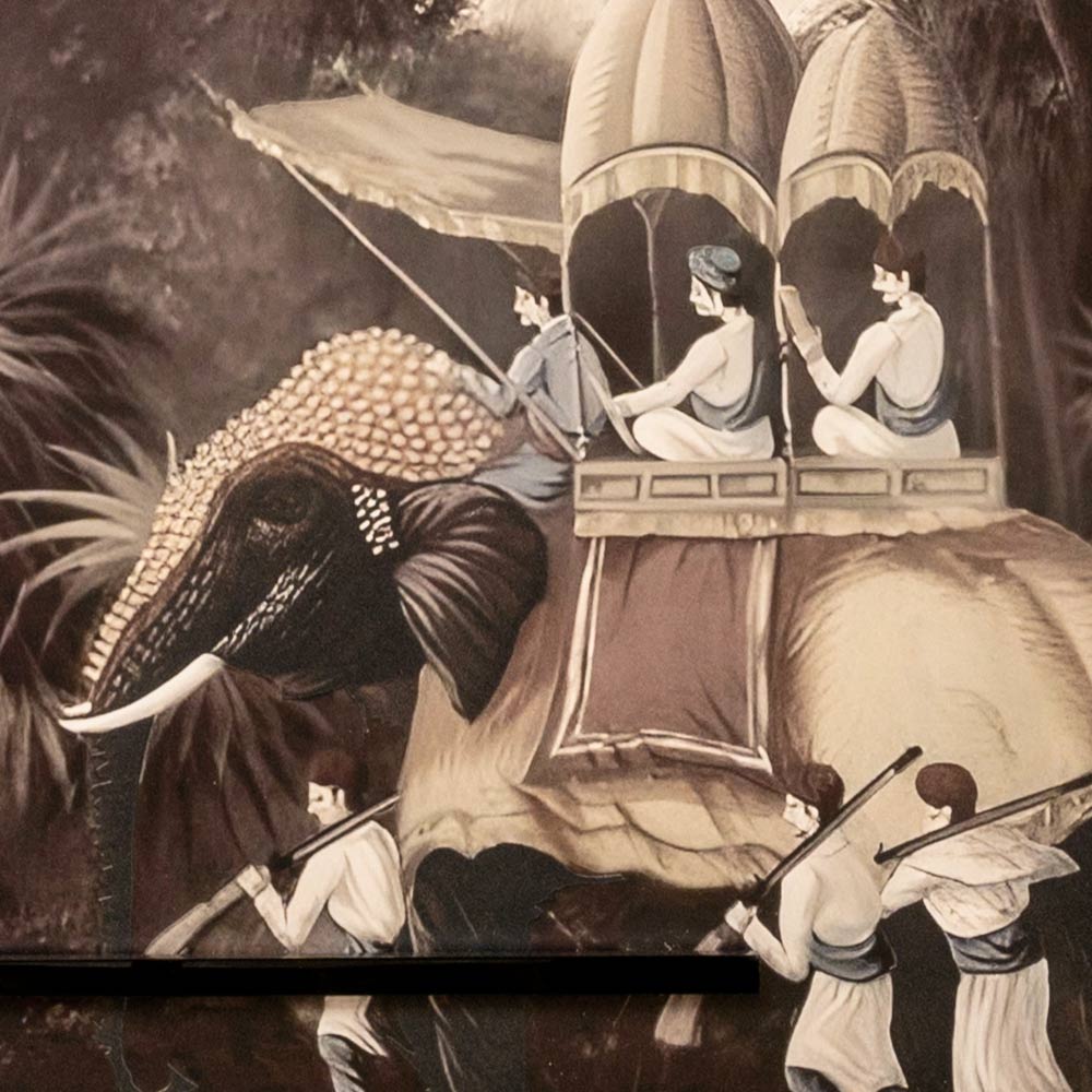 Composition de panneaux en bois avec impression d'un environnement exotique avec un éléphant et 2 planches de plexiglas noir en relief. Avec ce tableau, nous voulons donner à la pièce une atmosphère exotique et tropicale grâce à l'imprimé d'un éléphant avec un auvent et la forêt environnante qui rendent la composition parfaite pour compléter le décor de n'importe quelle pièce. Il a été entièrement fabriqué en Italie avec la sélection des meilleurs matériaux et avec soin et attention dans chaque processus de production.