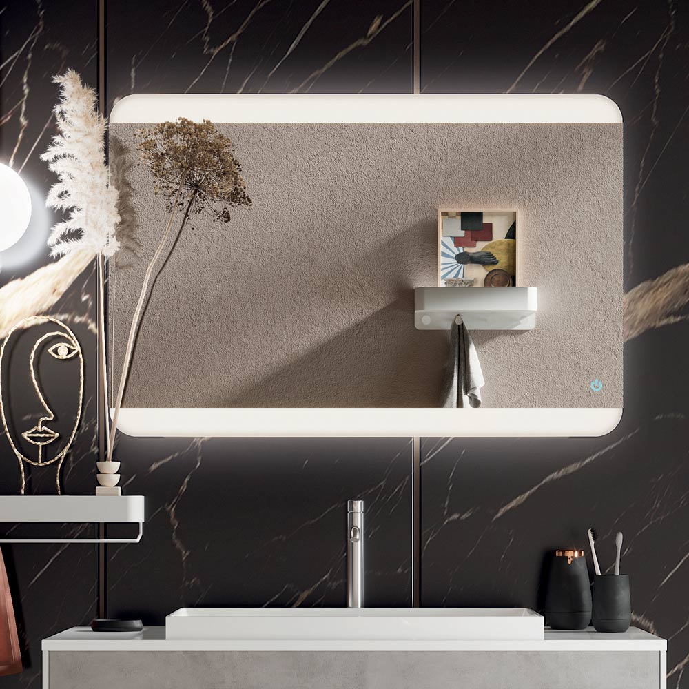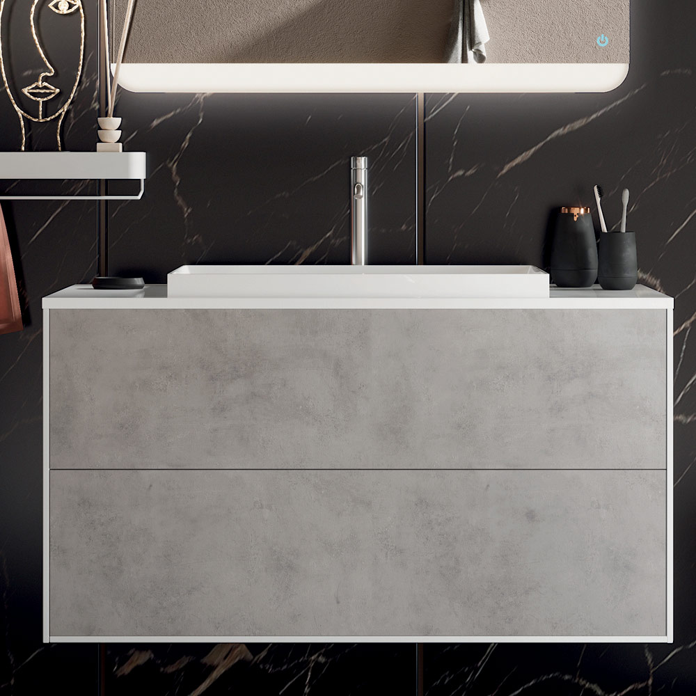 Composition de salle de bain complète avec lavabointégré en résine , miroir en verre avec LED frontales et périmétriques et baseen mélamine anti-rayures couleur ciment avec 2 tiroirs entièrement extractibles et fermeture amortie. La collection de style moderne rappelle les concepts de légèreté et de simplicité essentielle. Finitions et matériaux s'associent pour créer un meuble de salle de bain élégant, de qualité et fonctionnel.