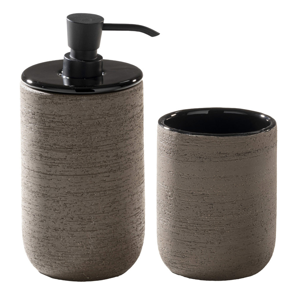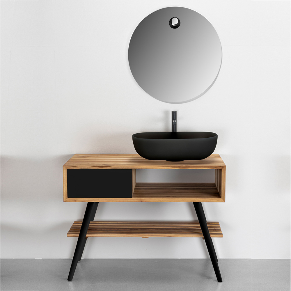Composition de meuble de salle de bain avec miroir, accessoires et vasque en résine noire.