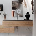 Composition de salle de bain complète avec miroir rectangulaire avec lampe LED , lavabo en céramique blanc brillant placé dans une base colorée miel avec tiroir en métal entièrement extractible et fermeture amortie reposant sur une autre base couleur miel avec tiroir en métal entièrement extractible et fermeture amortie.