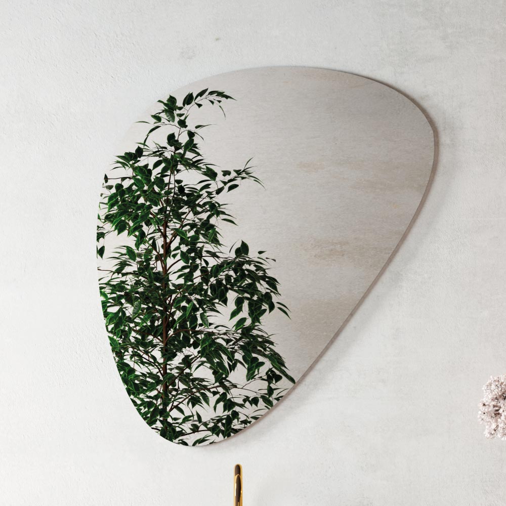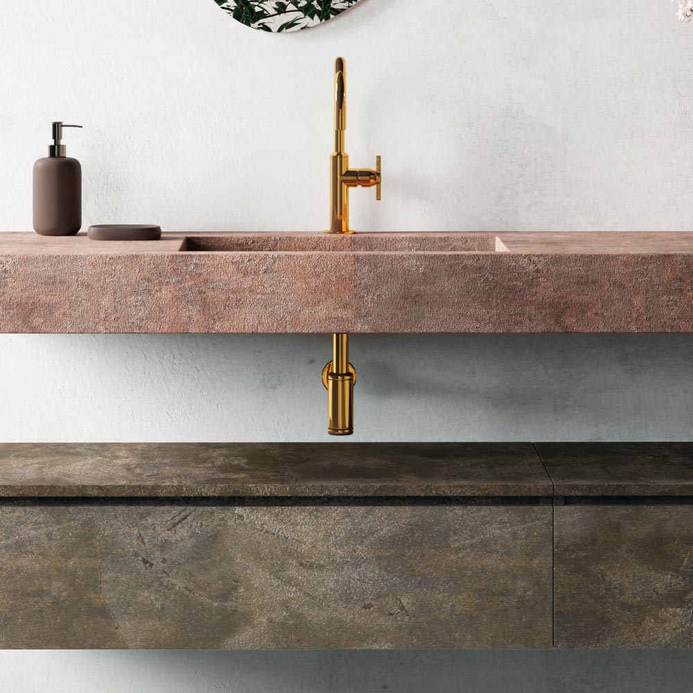 Composition de salle de bain composée d'un miroir de style moderne et d'une vasque console couleur corten base colorée en pierre de lave.