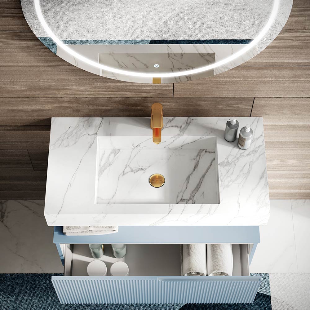 Composition de salle de bain en HPL Calacatta et MDF nervuré bleu Tiffany Made in Italy