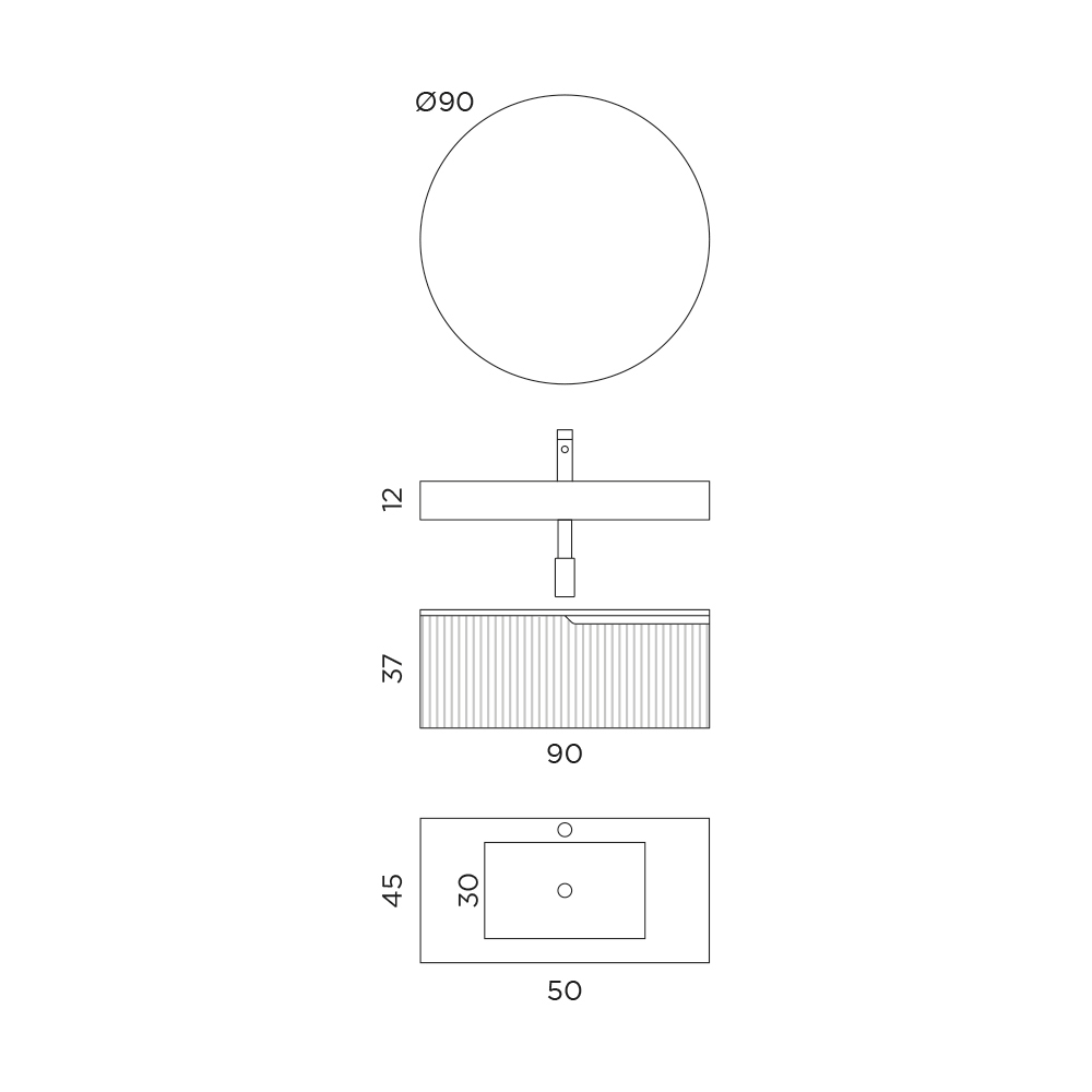 - Plateau avec vasque : Longueur 90 cm x Profondeur 45 cm x Hauteur 12 cm