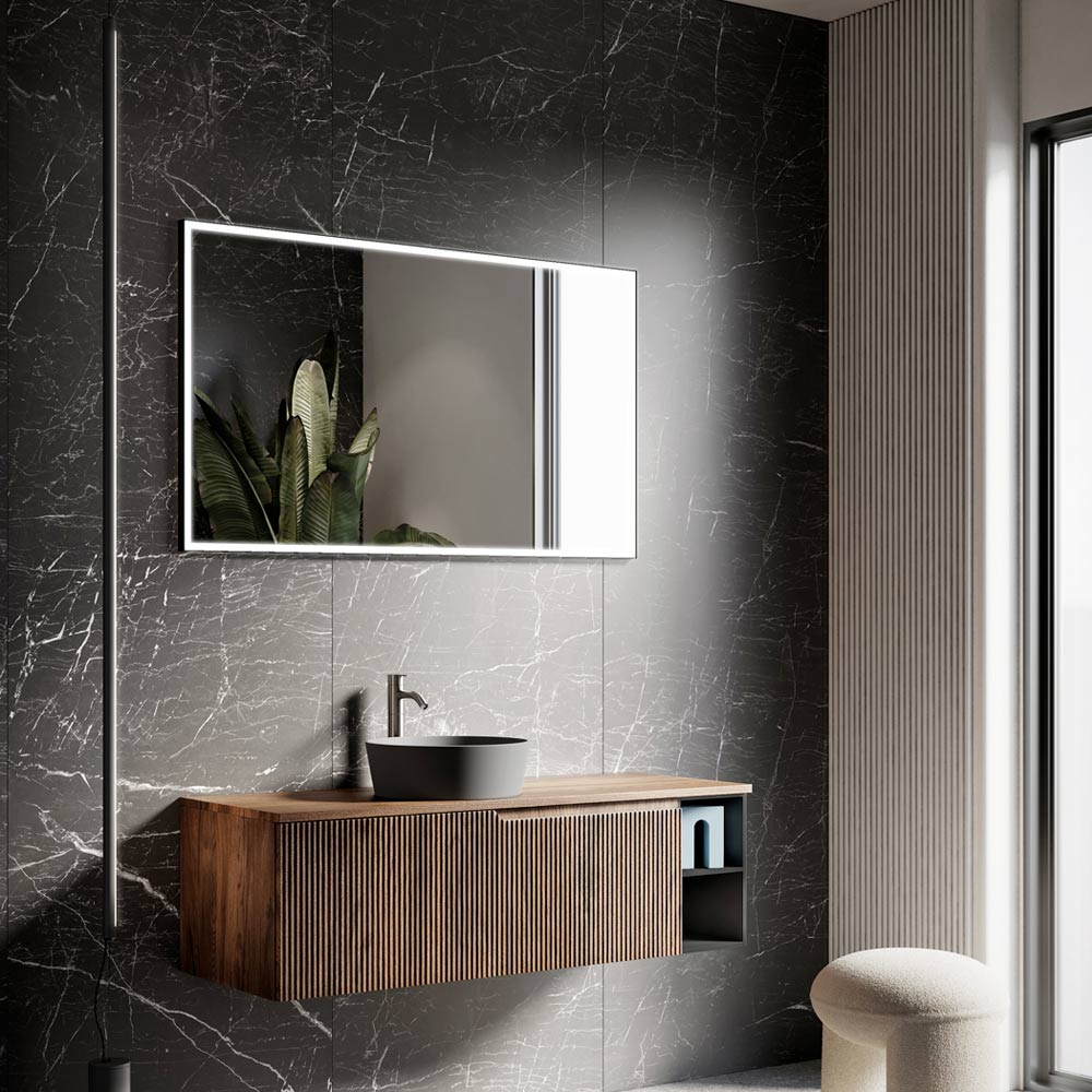 Composition de salle de bain entièrement réalisée en Italie composée d'une base avec 1 tiroir en MDF finition chêne Rio nervuré, un élément ouvert en MDF anthracite lisse, un lavabo en céramique noir mat, un miroir avec éclairage frontal LED et cadre noir. Cette composition de salle de bain a été créée pour allier style moderne et fonctionnalité afin de pouvoir répondre aux différents besoins de conception et de pouvoir donner une touche unique à l'espace. Les finitions simples et linéaires rendent ce meuble à la fois élégant et chic et se marient à la grande qualité et résistance des matériaux utilisés pour sa création.