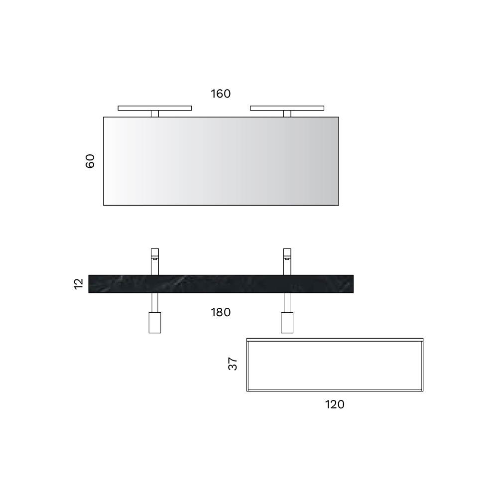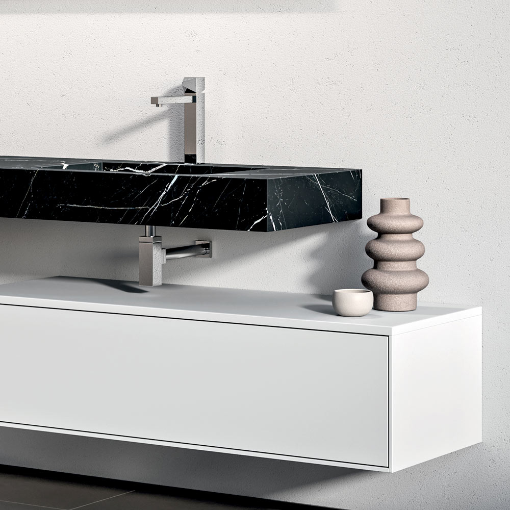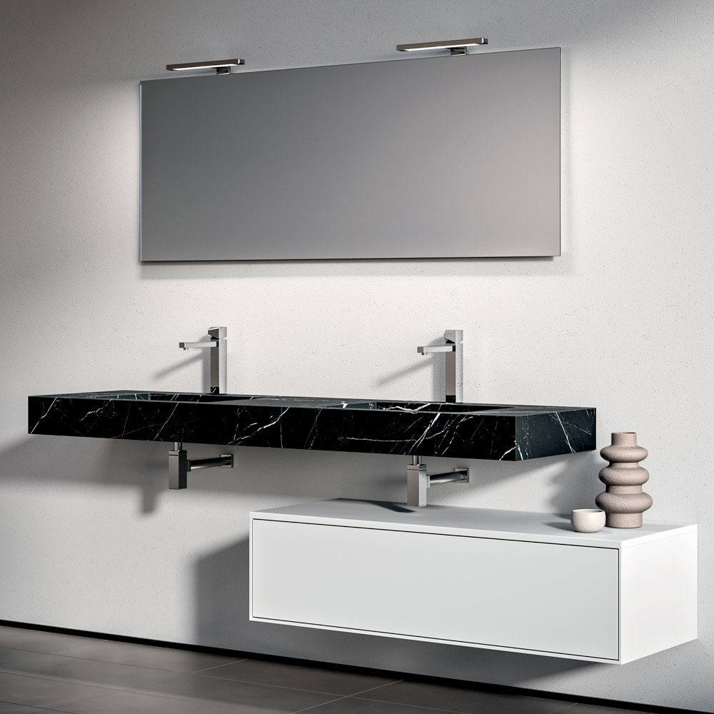 Une composition de salle de bains contemporaine et spectaculaire, conçue pour les grands espaces raffinés. Le double plan vasque en stratifié haute pression à effet Marquina apporte du caractère et de la profondeur visuelle, créant un contraste élégant avec le socle blanc mat .