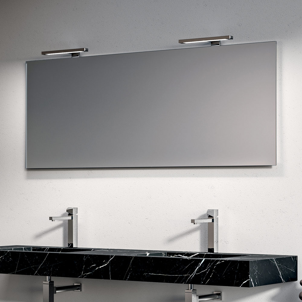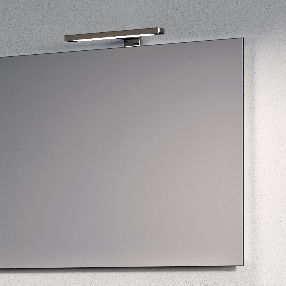 Le miroir rétroéclairé agrandit visuellement l'espace et diffuse une lumière uniforme et enveloppante, complétée par d'élégantes lampes LED chromées qui ajoutent une touche lumineuse et contemporaine.